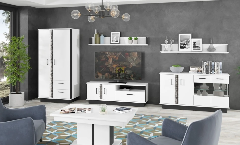 Spalva: korpusas – baltas matinis/juodas matinis; fasadai – balti blizgūs.