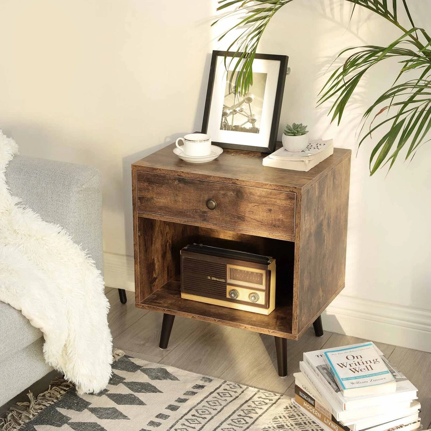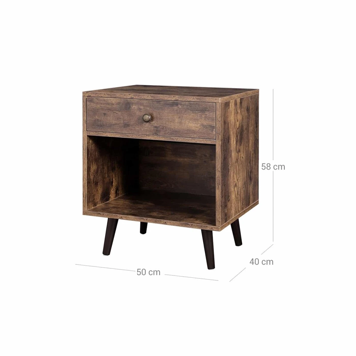 Aprašymas buvo automatiškai išverstas, gali pasitaikyti klaidų.Informacija apie gaminį: - Spalva: tamsiai ruda/vintažinė - Medžiaga: MDF, kojos iš pušies medienos - Dydis: 50 x 40 x 58 cm (P x P x A) - Svoris: 11,8 kg Pristatymo komplektas: - 1 x naktinis staliukas - 1 x priedų krepšys - 1 x Instrukcijos (DE,EN,FR,ES,IT)VASAGLE Pastabos:- Nelaikykite gaminio lauke ilgą laiką. Jis skirtas naudoti patalpose.- Nenaudokite gaminio drėgnoje aplinkoje.- Gaminys neturi liestis su aštriais daiktais ir agresyviomis cheminėmis medžiagomis, kad būtų išvengta žalos.
