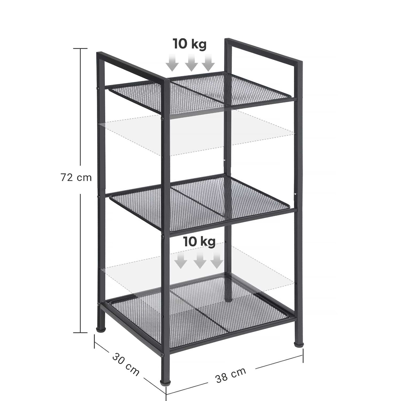 Aprašymas buvo automatiškai išverstas, gali pasitaikyti klaidų.Šios vonios lentynos akcentai trumpai:- Dėl reguliuojamo aukščio lentynų šioje lentynoje galite laikyti įvairių dydžių daiktus.- Galite sujungti kelias iš šių lentynų, kad sukurtumėte daugiau vietos.- Ši kompaktiška virtuvės lentyna Mažas grindų plotas.- Kiekviena šios lentyna Augalų lentyna gali atlaikyti iki 10 kg svorį - Grindų tinklelio lentynos vonios lentynai suteikia gerą stabilumą ir atsparumą - Reguliuojamos kojelės kompensuoja nedidelius grindų nelygumus - Paprastos, suprantamos instrukcijos ir aiškiai pažymėtos dalys leidžia lengvai surinkti Stačiamas lentynas.- Stilinga ir praktiška, ši lentyna telpa įvairiose erdvėse.Informacija apie gaminį: - Spalva: juoda - Medžiaga: plienas - Dydis: 38 x 30 x 72 cm (P x P x A) - Svoris: 2,1 kg - Maksimali statinė apkrova vienam lygiui: 10 kg Pristatymo apimtis: - 1 x vonios kambarys lentyna - 1 x Priedų paketas - 1 x Apsauga nuo apvirtimo - 1 x Instrukcijos SONGMICS Pastabos: - Montuojant kiekvieną lentyną, keturios šoninio rėmo skylės turi būti viename aukštyje.