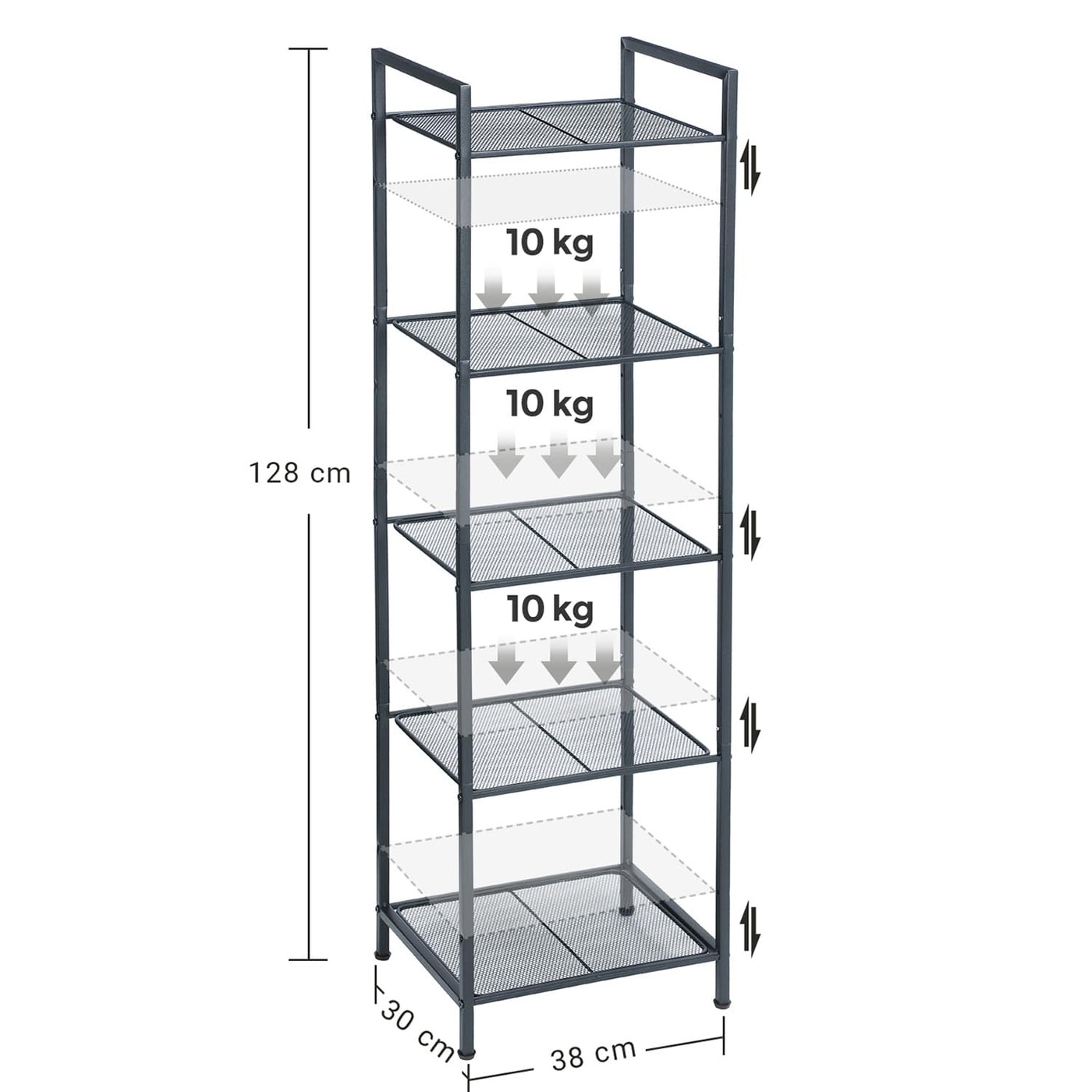 Aprašymas buvo automatiškai išverstas, gali pasitaikyti klaidų.Šios vonios lentynos akcentai trumpai:- Dėl reguliuojamo aukščio lentynų šioje lentynoje galite laikyti įvairių dydžių daiktus.- Galite sujungti kelias iš šių lentynų, kad sukurtumėte daugiau vietos.- Ši kompaktiška virtuvės lentyna Mažas grindų plotas.- Kiekviena šios lentyna Augalų lentyna gali atlaikyti iki 10 kg svorį - Grindų tinklelio lentynos vonios lentynai suteikia gerą stabilumą ir atsparumą - Reguliuojamos kojelės kompensuoja nedidelius grindų nelygumus - Paprastos, suprantamos instrukcijos ir aiškiai pažymėtos dalys leidžia lengvai surinkti Stačiamas lentynas.- Stilinga ir praktiška, ši lentyna telpa įvairiose erdvėse.Informacija apie gaminį: - Spalva: juoda - Medžiaga: plienas - Dydis: 38 x 30 x 128 cm (P x P x A) - Svoris: 3,3 kg - Maksimali statinė apkrova vienam lygiui: 10 kg Pristatymo apimtis: - 1 x vonios kambarys lentyna - 1 x Priedų paketas - 1 x Apsauga nuo apvirtimo - 1 x Instrukcijos SONGMICS Pastabos: - Montuojant kiekvieną lentyną, keturios šoninio rėmo skylės turi būti viename aukštyje.