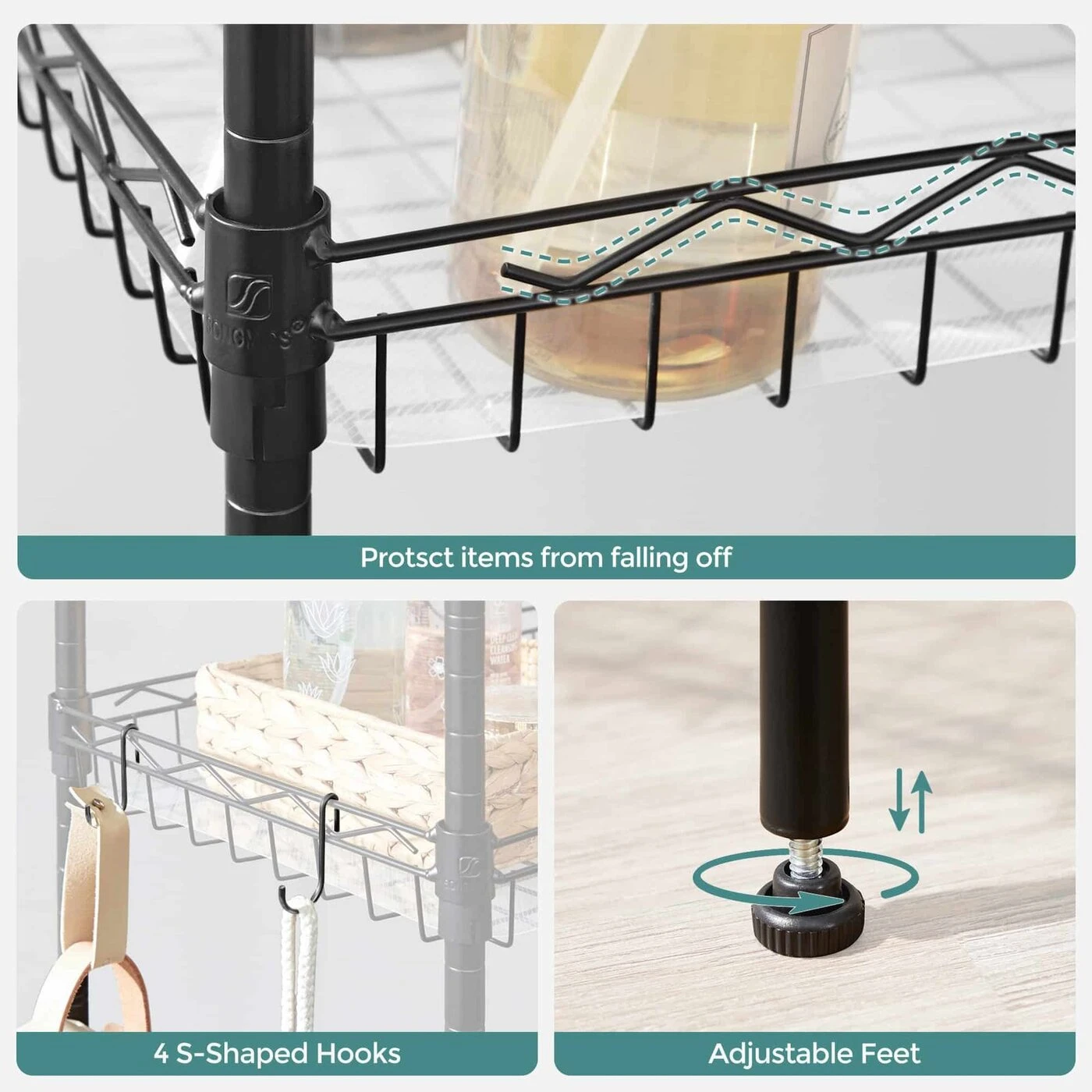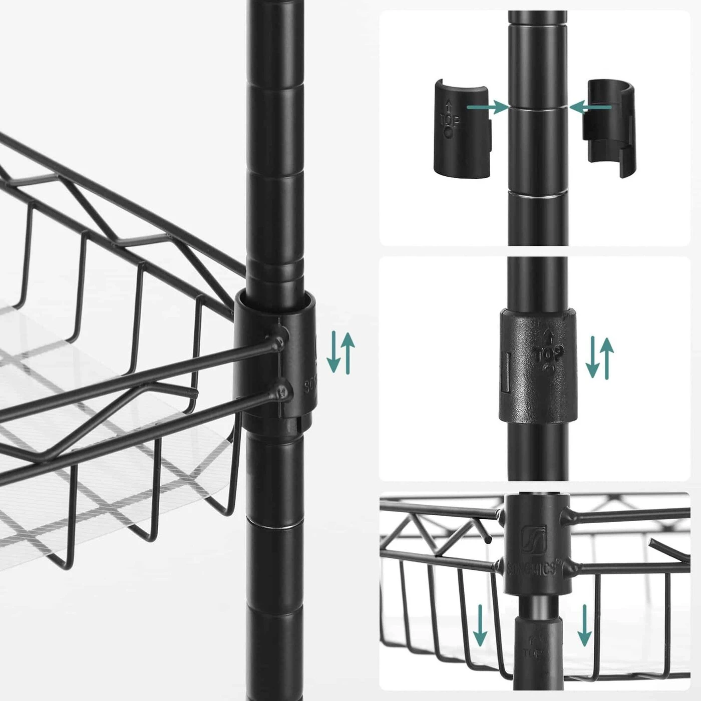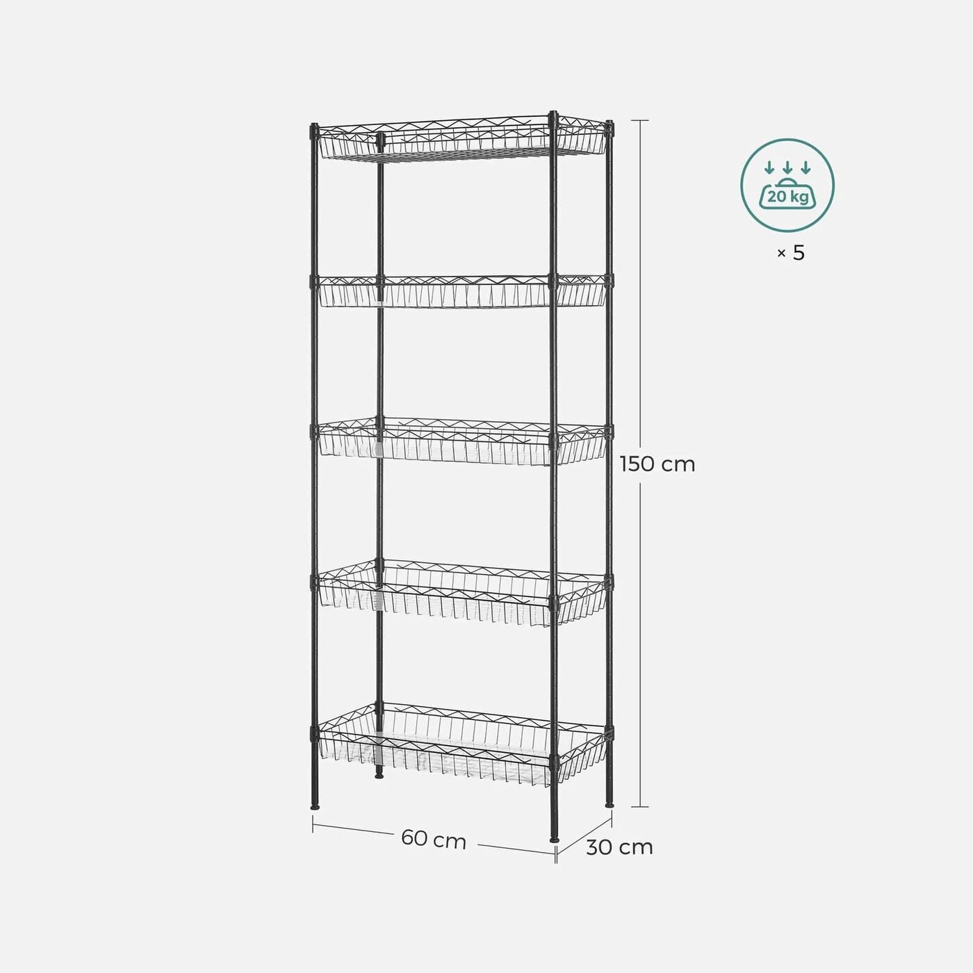 Aprašymas buvo automatiškai išverstas, gali pasitaikyti klaidų.Išsami informacija apie gaminį: Spalva: Juoda Medžiaga: Plienas Dydis: 60 x 30 x 150 cm (P x P x A) Svoris: 5,4 kg Maks. Statinė apkrova vienam lentynos lygiui: 20 kgPristatymo komplektacija: 1 x laikymo lentyna 5 x PP plokštė 4 x kabliukai 1 x apsauga nuo apvirtimo 1 x instrukcijos SONGMICS Pastabos: Montuojant plastikinius spaustukus, rodyklė VIRŠUS visada turi būti nukreipta į viršų. Surinkę patikrinkite visus spaustukus ir įsitikinkite, kad jie daugiau nejuda. Įsitikinkite, kad atraminiai spaustukai yra pritvirtinti prie 4 vamzdžių tame pačiame aukštyje, kad lentynos būtų horizontalioje plokštumoje. Didžiausia statinė apkrova vienam lentynos lygiui yra 20 kg. Prašome neviršyti šio maksimalaus svorio. Pritvirtinkite gaminį prie sienos su apsaugos nuo apvirtimo įtaisu, kad užtikrintumėte saugų naudojimą.
