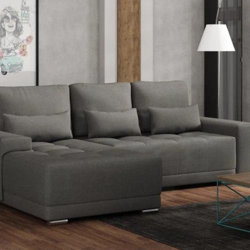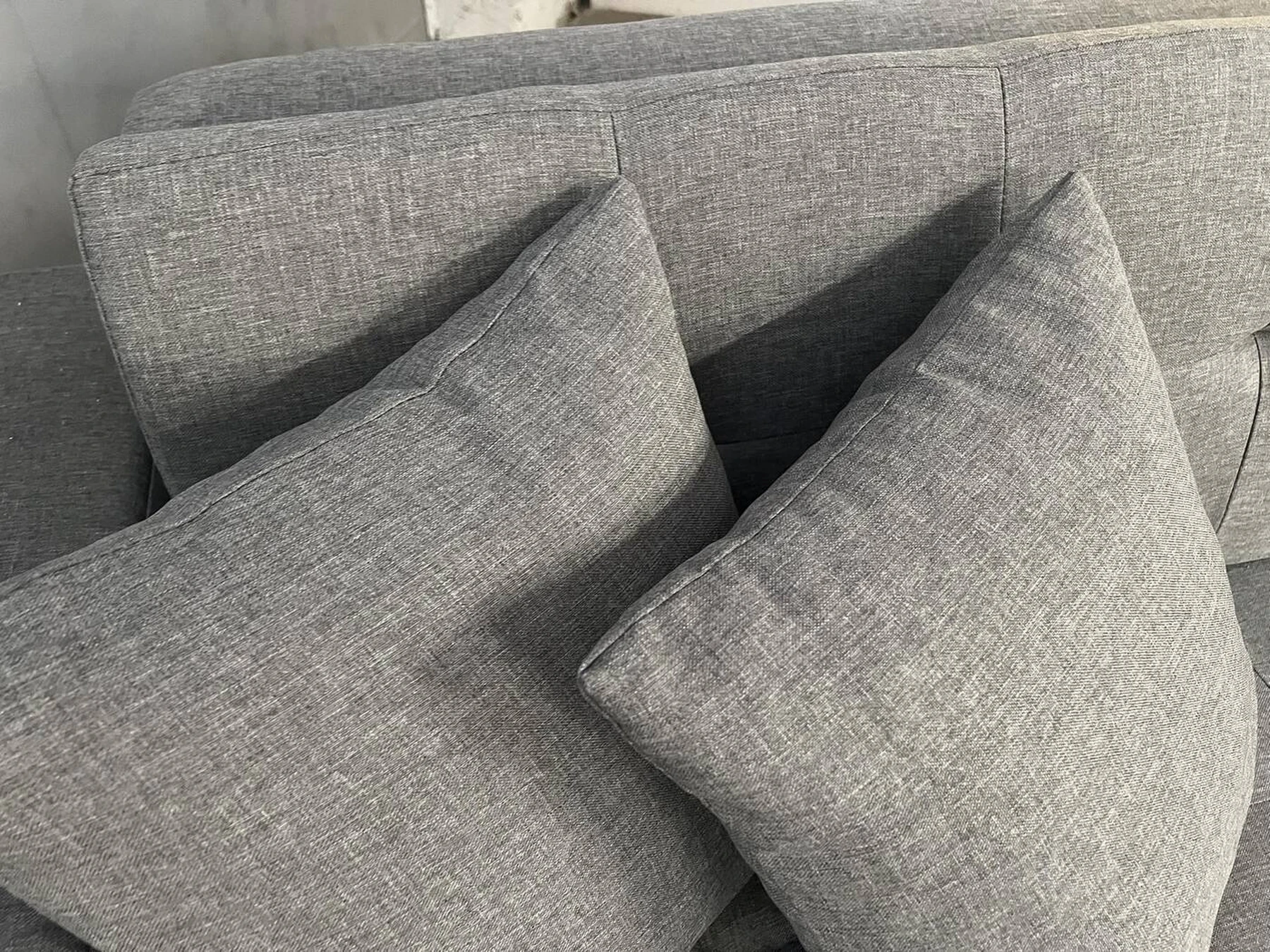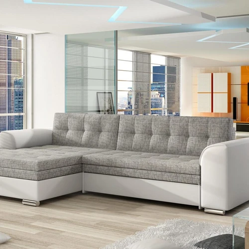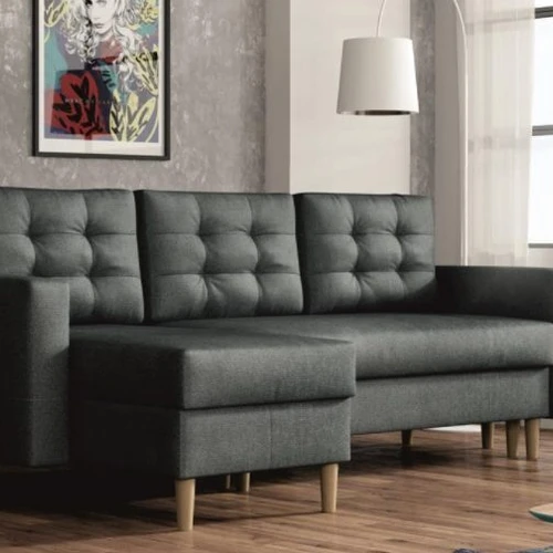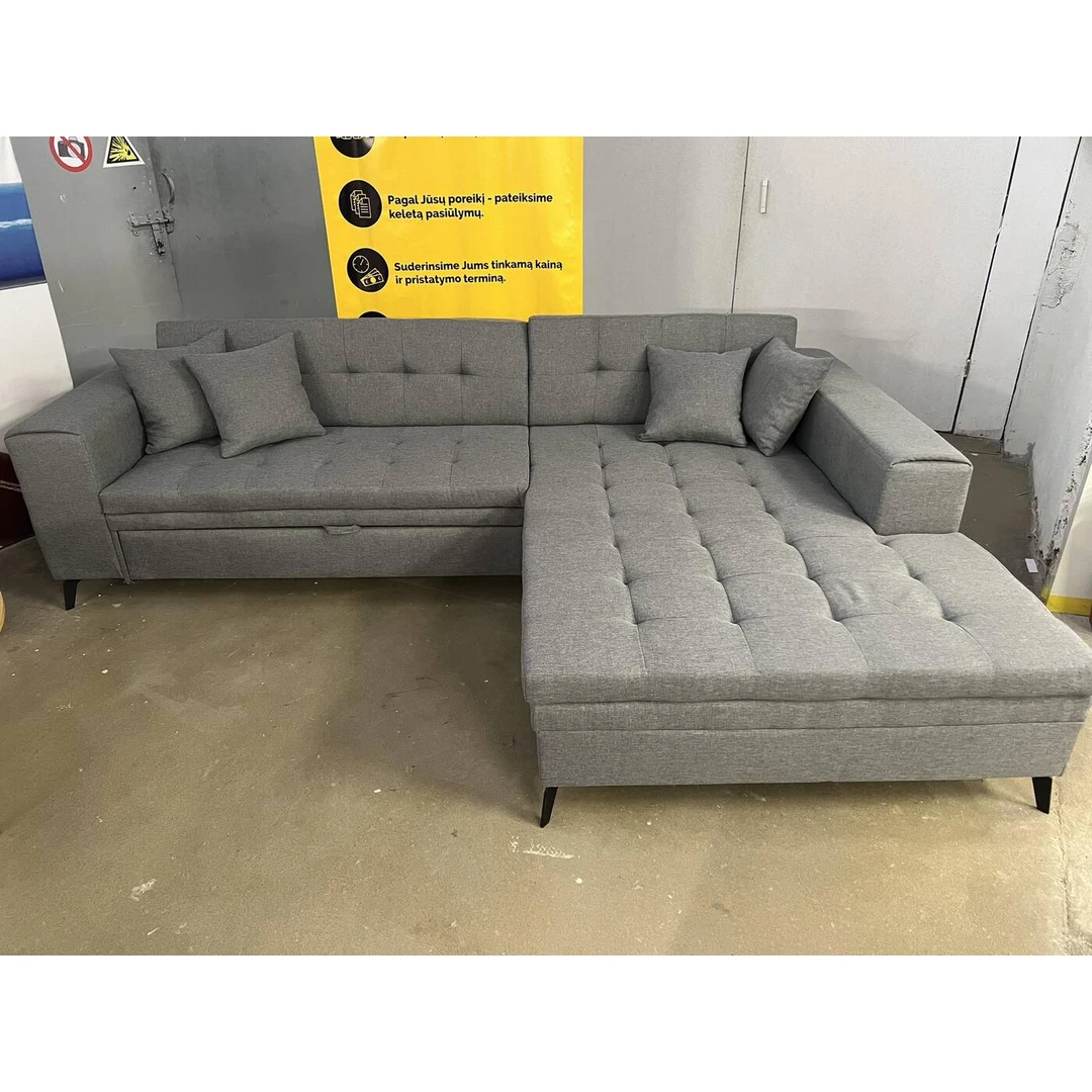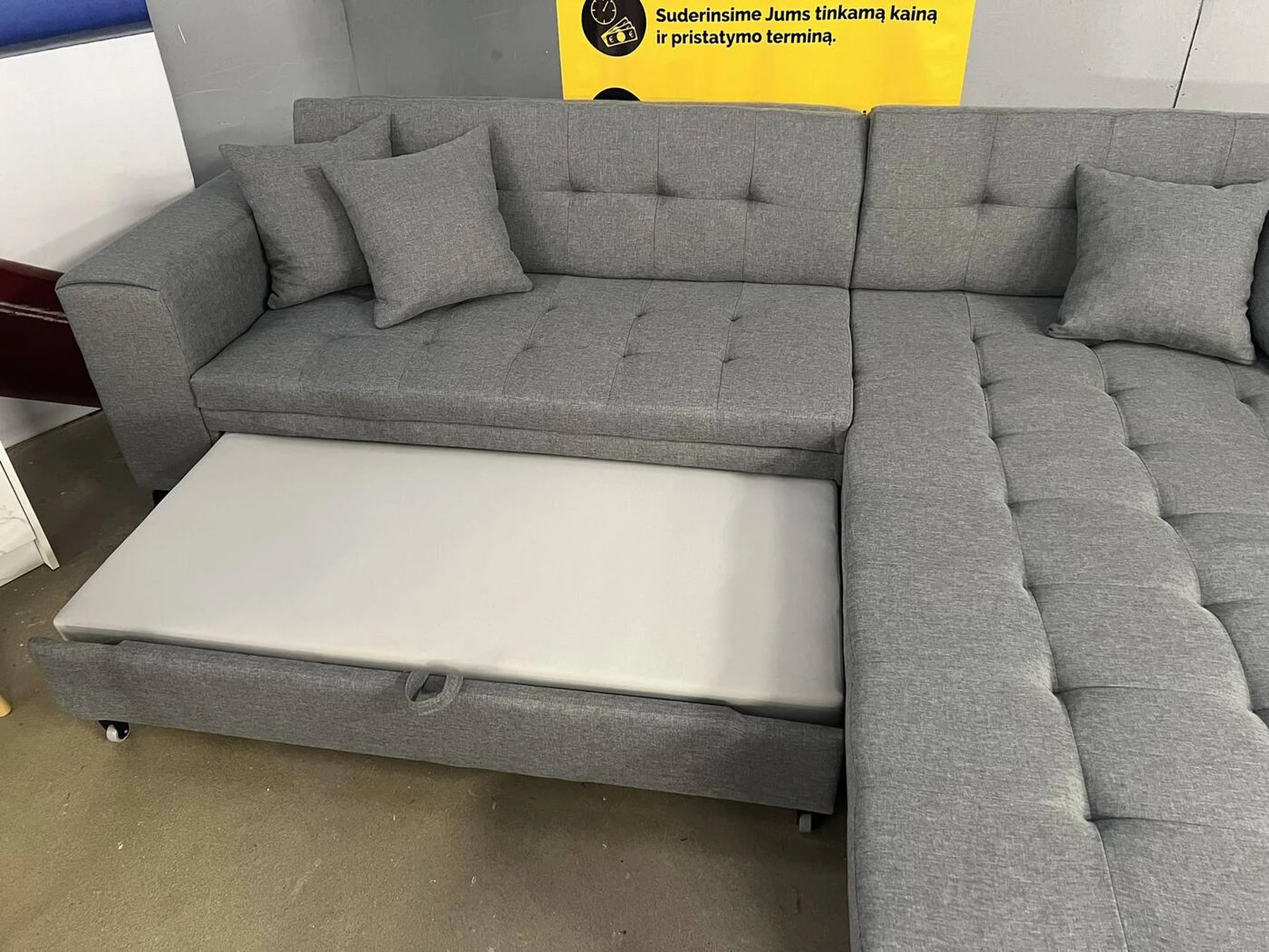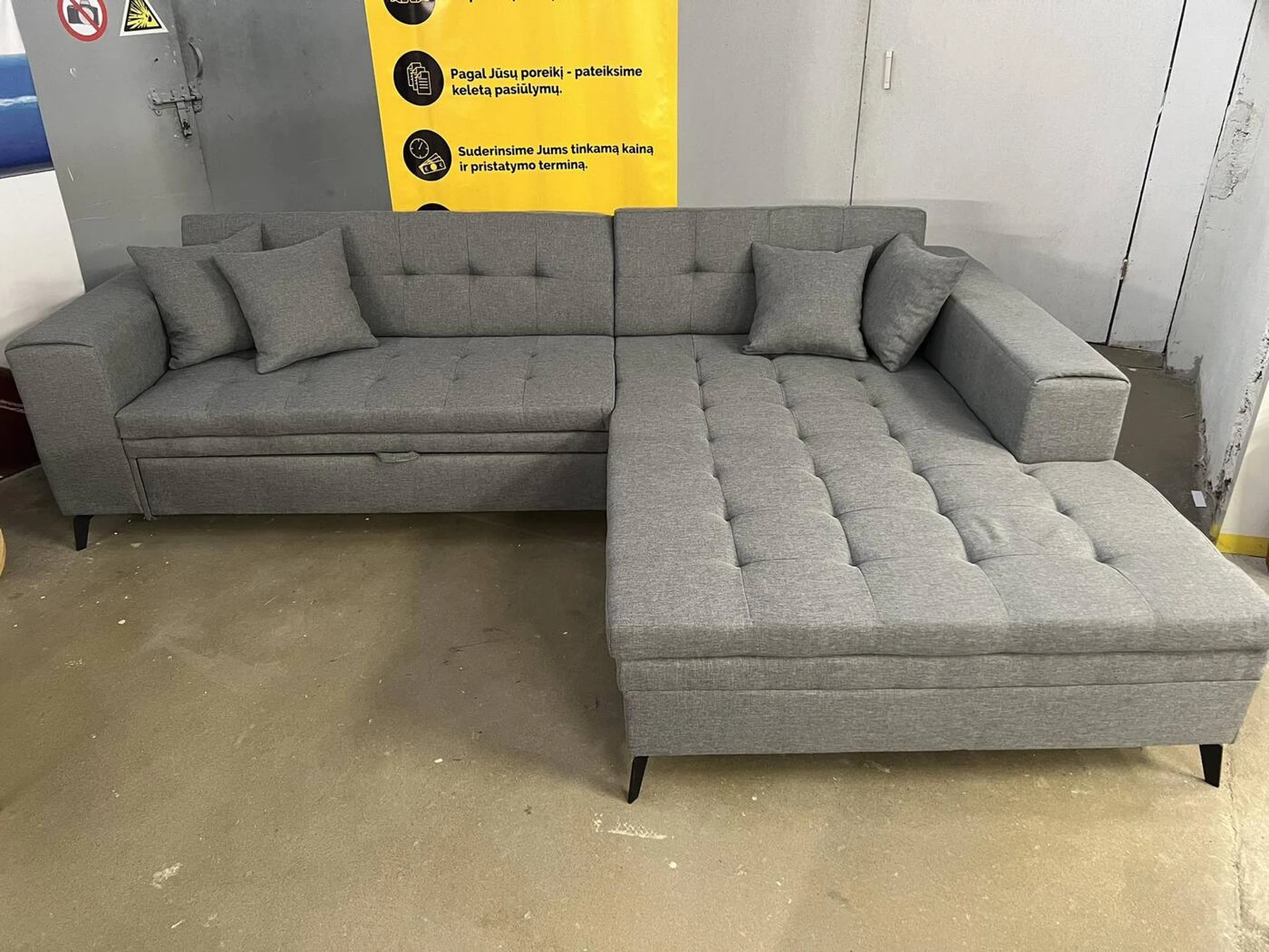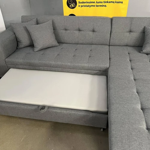 Parduodamas naujas minkštas kampas iš parduotuvės su delfino tipo lovos mechanizmu. Patalynės dėžės nėra. Vidutinio kietumo, nepatiks ieškantiems labai minkšto baldo. Audinys smulkiai austas, tvirtas ir gerai valosi. Prie kampo komplekte yra keturios mažos pagalvėlės.