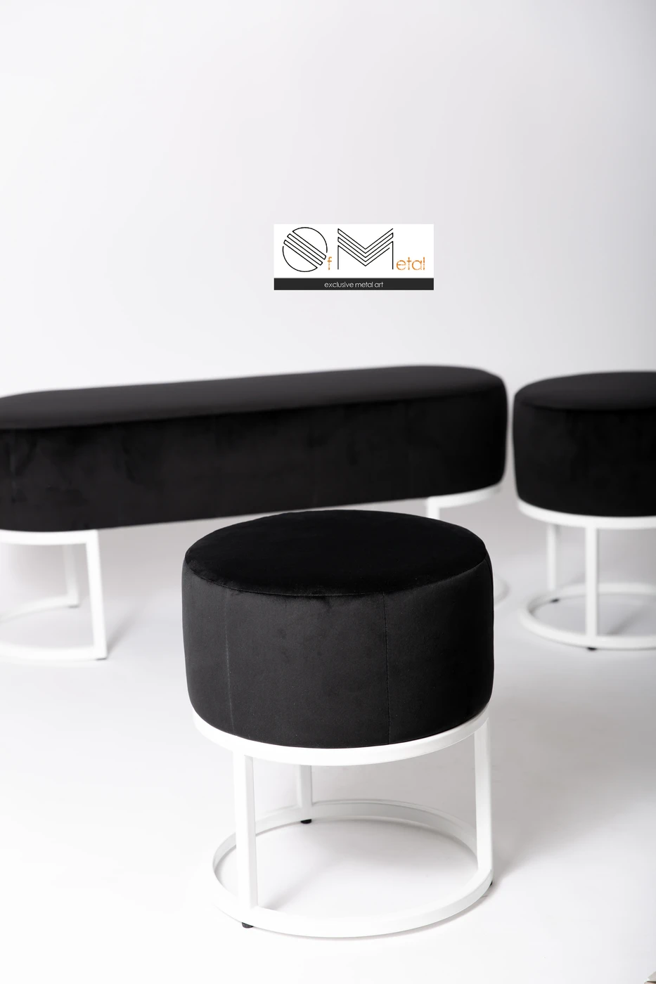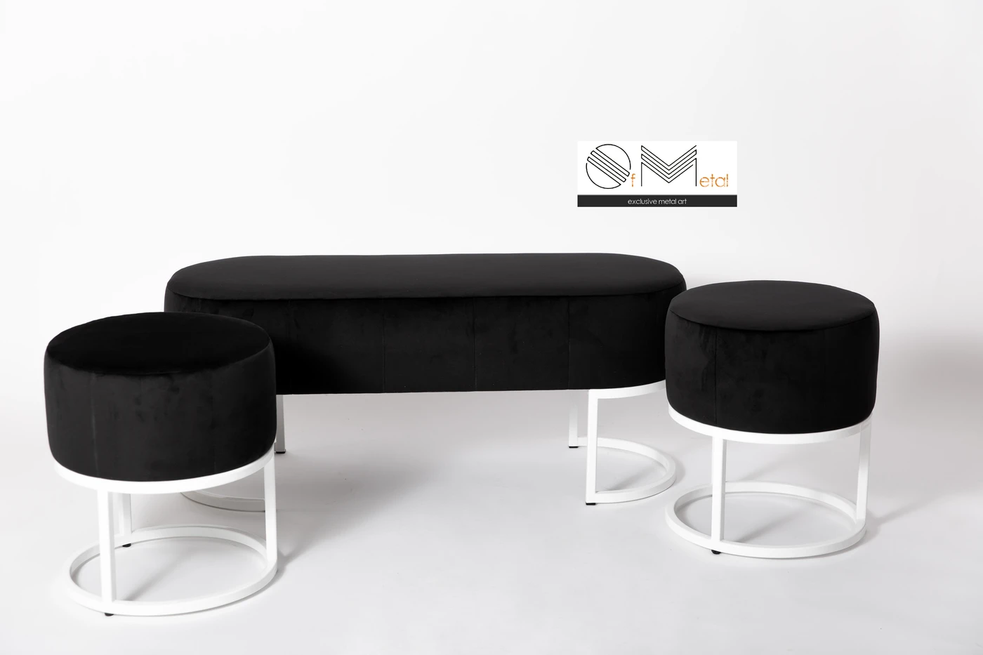 Didžiojo suoliuko ilgis 110cm, apvalių pufų skersmuo 40cm. Išmatavimus, audinį ir rėmo spalvą galima koreguoti pagal jūsų poreikius. Suoliuko kaina 250e, pufo kaina 130e
