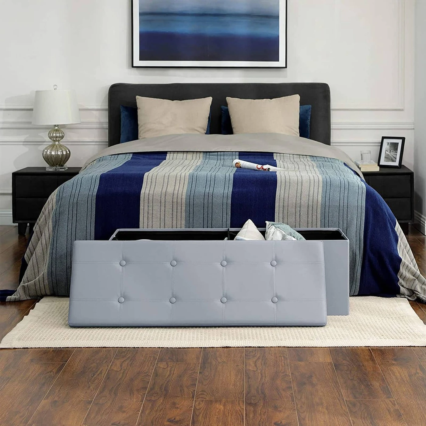 Aprašymas buvo automatiškai išverstas, gali pasitaikyti klaidų.Geriausiu Chesterfield būdu šis suoliukas yra optimalus žinomų anglų modelių variantas. Užvalkalas iš pilkos dirbtinės odos suteikia baldui papildomo žavesio ir užtikrina, kad jis ypač patvarus. Sutaupysite daugiau vietos nei sofa ar drabužių spinta Užuot pirkę kitą sofą papildomai sėdėti svetainėje arba naują spintą, kad miegamajame būtų daugiau vietos, galite būti „vienu dydžiu mažesniu“ su šia kėdute. Padėkite jį priešais savo sofą arba padėkite patogius minkštus baldus prie lovos kojos ir įdėkite patalynę ar pižamą. Stilingą dėžutę lengva atidaryti, uždaryti ir sulankstyti. MDF konstrukcija taip pat užtikrina stabilų laikymą, todėl ant krūtinės vienu metu gali atsisėsti du žmonės iki 300 kg (statinė apkrova). SONGMICS jums paruošta daug daugiau protingų gyvenimo idėjų: žiūrėti yra aiškiai leidžiama!Išsami informacija apie gaminį: - Spalva: Pilka - Medžiaga: PVC, MDF (vidutinio tankio medienos plaušų plokštė), putplastis - Dydis: 110 x 38 x 38 cm (P x P x A) - Svoris: 8,8 kg - Maks. statinė apkrova: 300 kg Pristatymo apimtis: - 1 x suoliuko prekės aprašymas