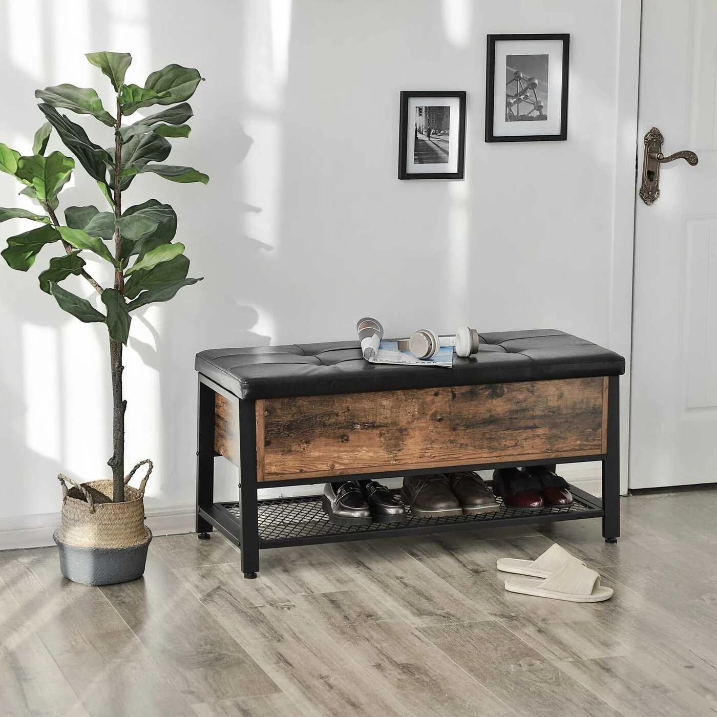 Aprašymas buvo automatiškai išverstas, gali pasitaikyti klaidų.Elegantiška pramoninio dizaino komoda Galite tikėtis šių privalumų: - Madingo pramoninio dizaino baldai su Chesterfield raštu - Lengvai valomi, patvari PU sintetinė oda - 40 mm storio apmušalai, užtikrinantys didelį sėdėjimo komfortą - Stabilus plieninis rėmas ; Maksimali keliamoji galia: 120 kg - Su papildoma vieta po sėdyne ir ant grotelių lentynos - Galima naudoti kaip lovos skrynią, batų lentyną ar suoliuką. Informacija apie gaminį: - Spalva: vintažinė ruda-juoda (viršelis šiek tiek blizgus, plienas matinė juoda) - Medžiaga: putplastis, PU sintetinė oda, medžio drožlių plokštė, plieninis rėmas - Dydis: 100 x 47 x 40 cm (P x A x G) - Svoris : 20 kg - Maksimali keliamoji galia: 120 kg Pristatymo komplektas: - 1 x sėdynė - 1 x krepšys priedams - 1 x rankinis (DE, EN, FR, ES, IT)