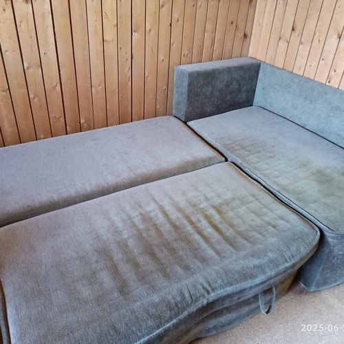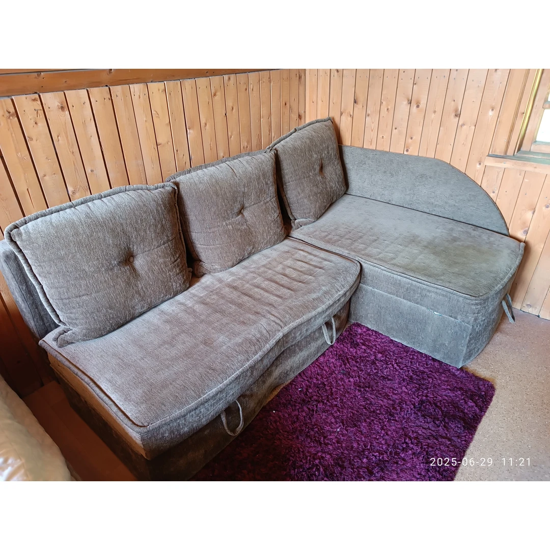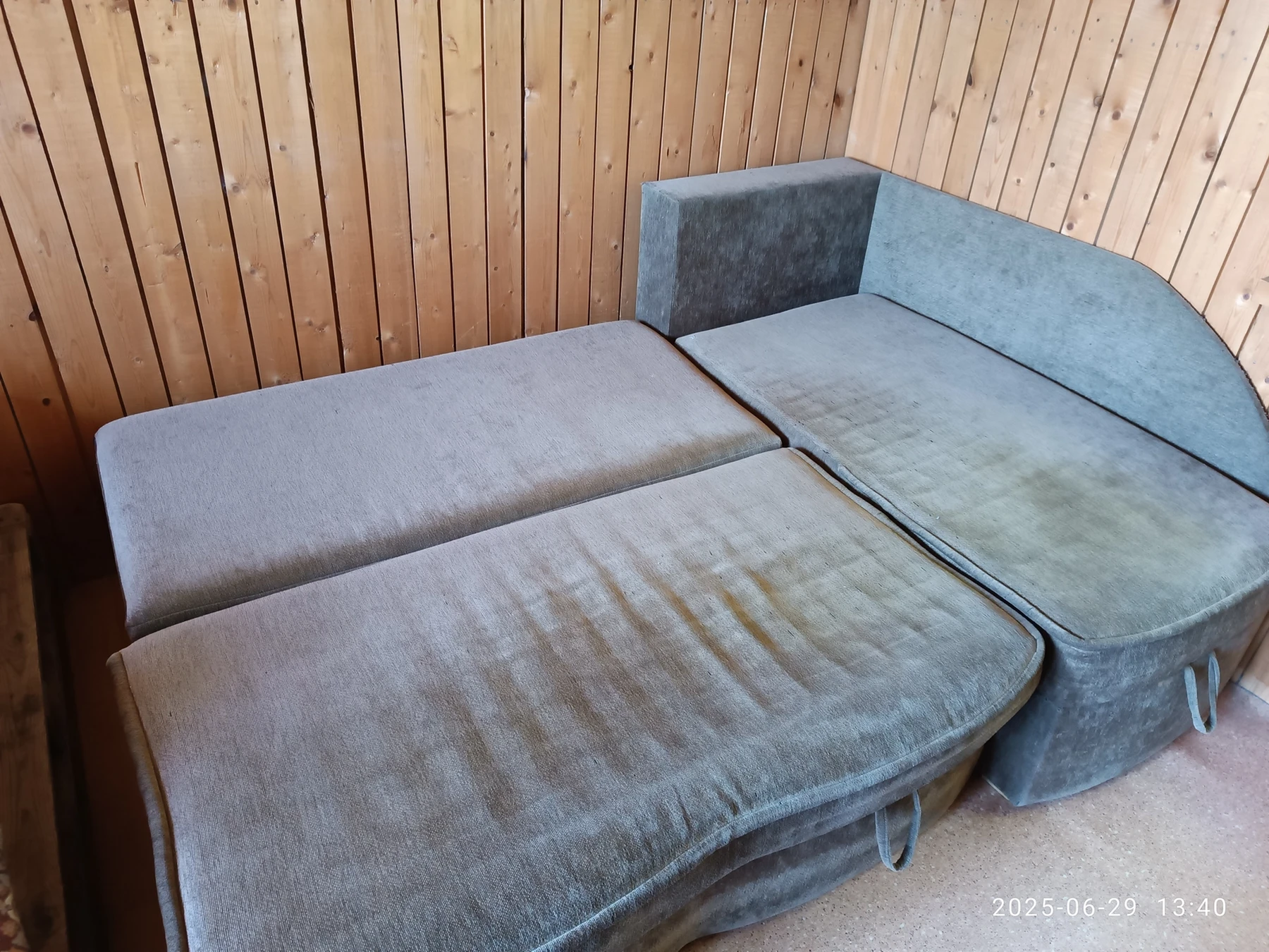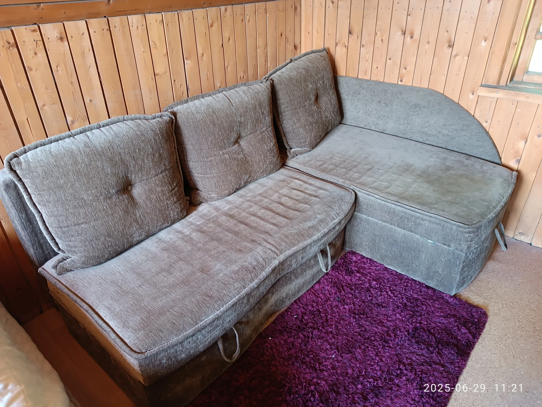 Parduodamas minkštas kampas. Yra dvi patalynės dėžės. Išsitiesia.