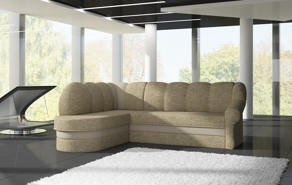 Minkštas kampas su miegama dalimi ir patalynės dėže, kai svetainėje norisi paprastumo