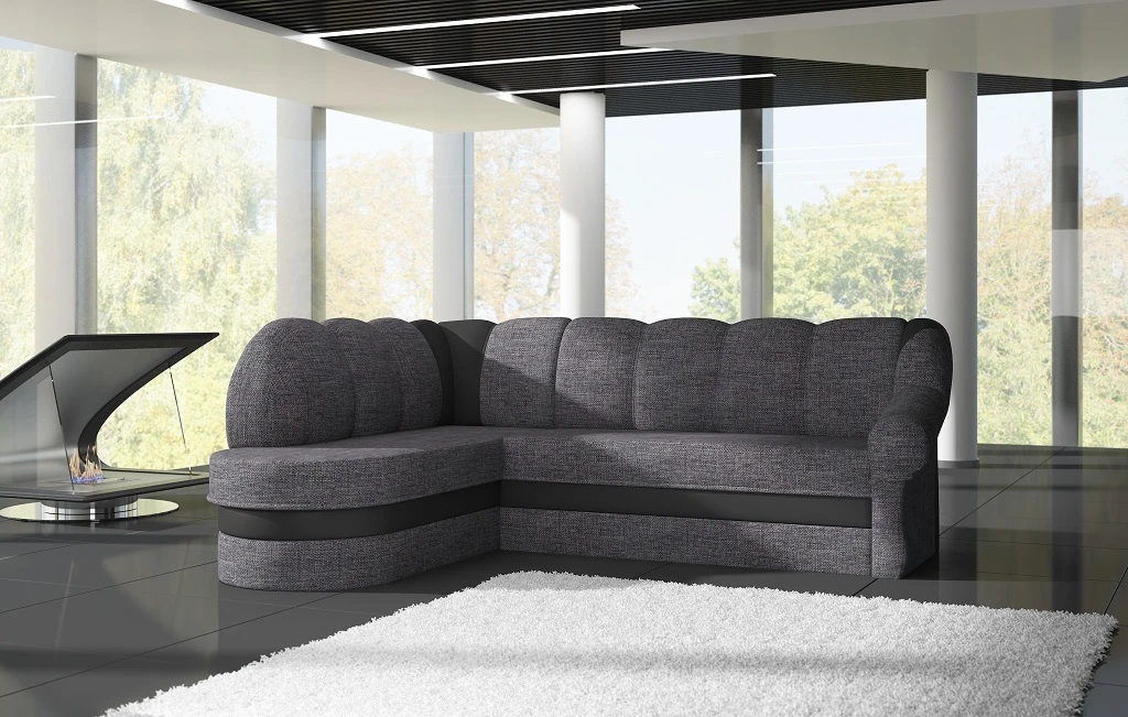 Minkštas kampas su miegama dalimi ir patalynės dėže, kai svetainėje norisi paprastumo
