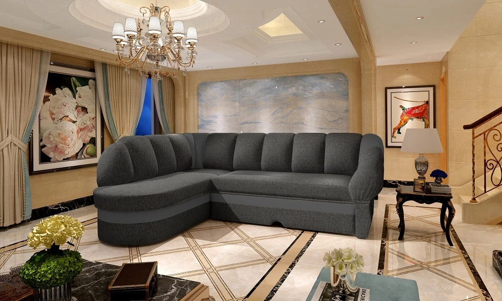 Minkštas kampas su miegama dalimi ir patalynės dėže, kai svetainėje norisi paprastumo