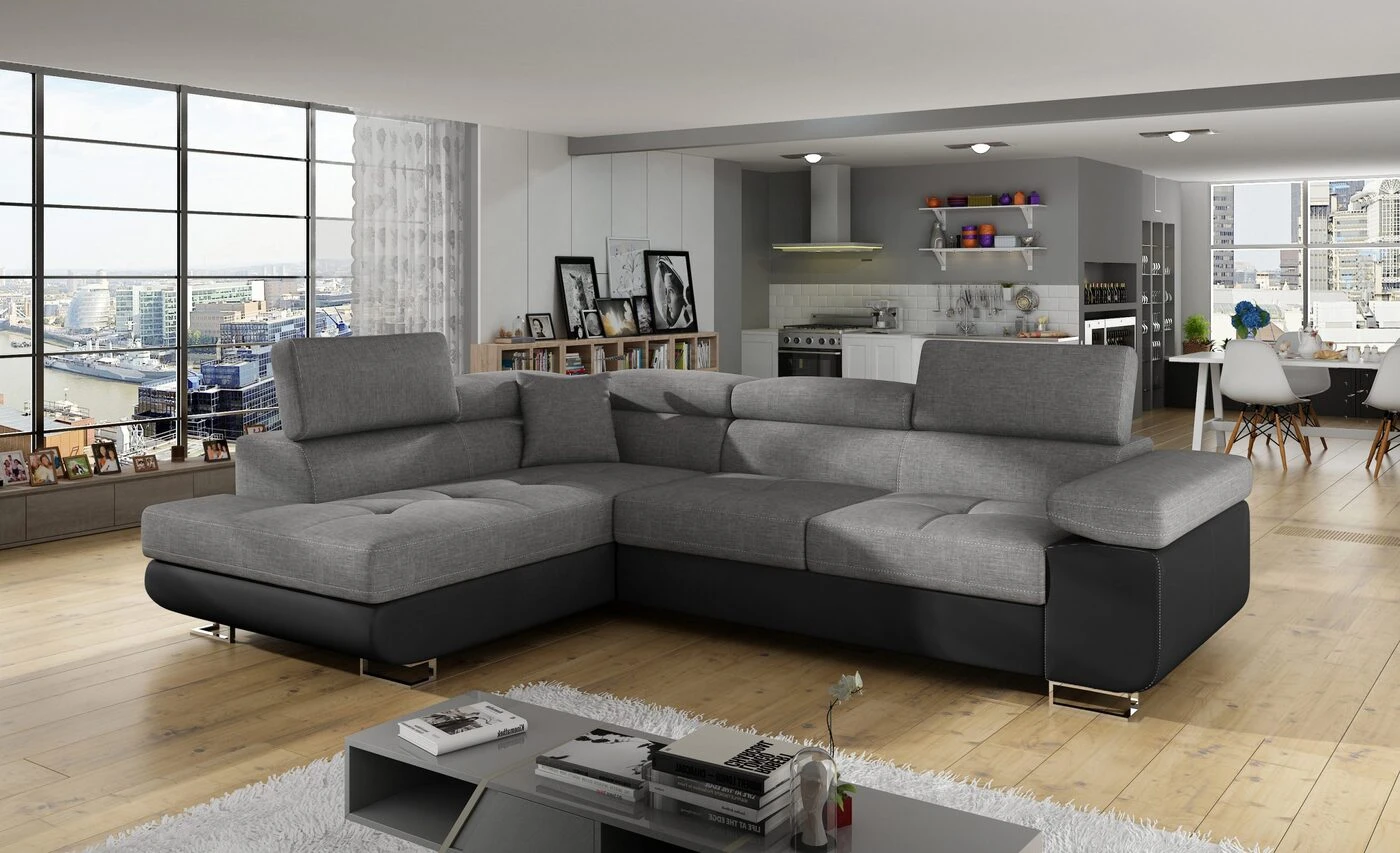Erdvus minkštas kampas, įdomaus dizaino funkcionalus baldas šiuolaikiškiems namams. Kampas pasižymi patvaria konstrukcija – šiek tiek užapvalintais šonais, plačiu porankiu, aukštomis, blizgiomis chromuotomis metalinėmis kojelėmis, subtiliu dygsniuotu dizainu ir siūlėmis ant sėdynių bei patogiomis galvos atramomis. Papildomas privalumas tai trijų galvos atramų reguliavimo galimybė - skirtingiems poreikiams. Patvari, stabili baldo konstrukcija derinama su patogiu sėdynės užpildu iš dilimui atsparių gofruotų spyruoklių ir išskirtinai lankstaus bei patogaus naudoti T30 porolono. Minimalistinio stiliaus kampo veliūriniai apmušalai atsparūs trinčiai ir blukimui. Baldas turi pritaikytą miegojimo funkciją ir erdvę patalynės dėžę.