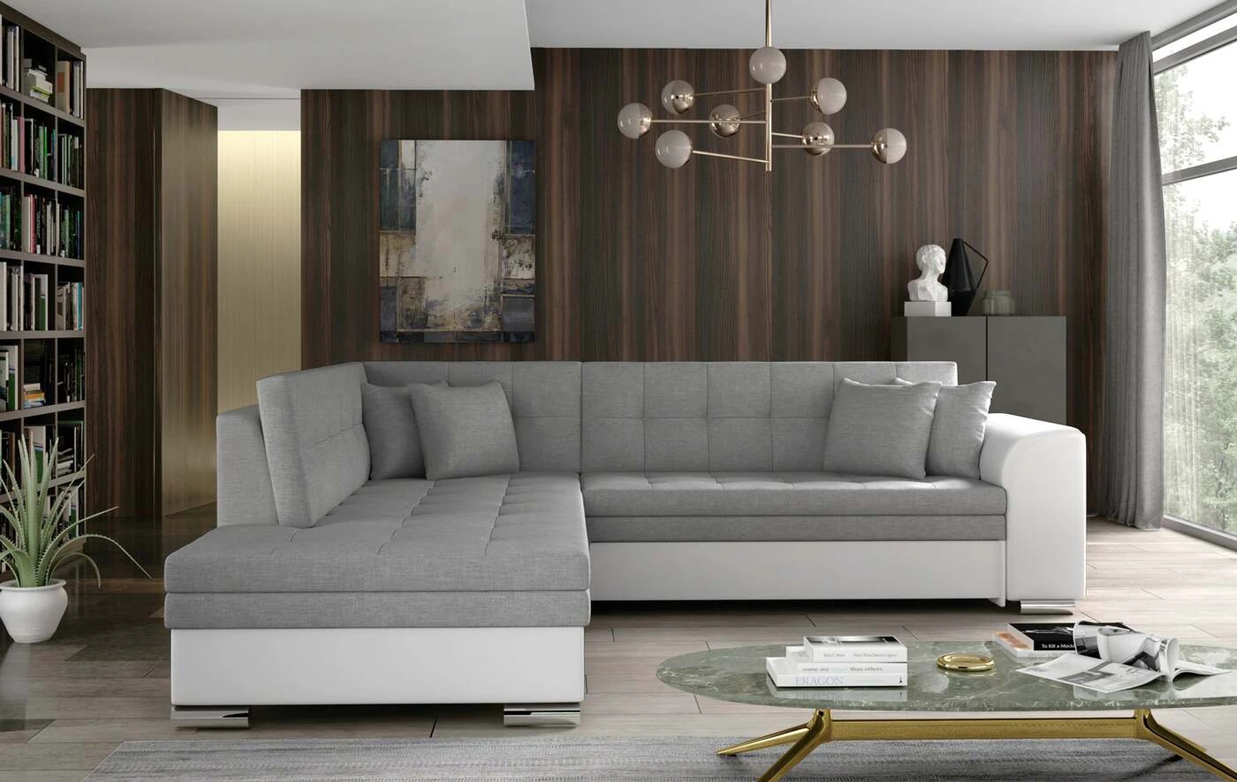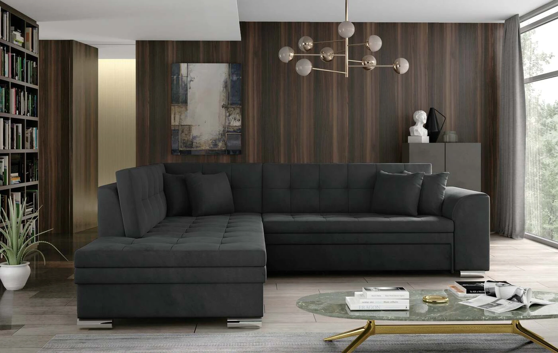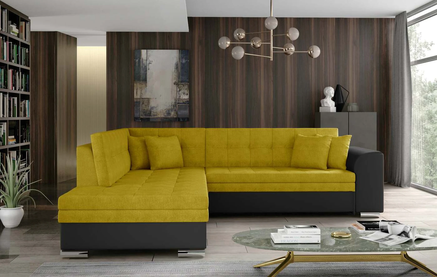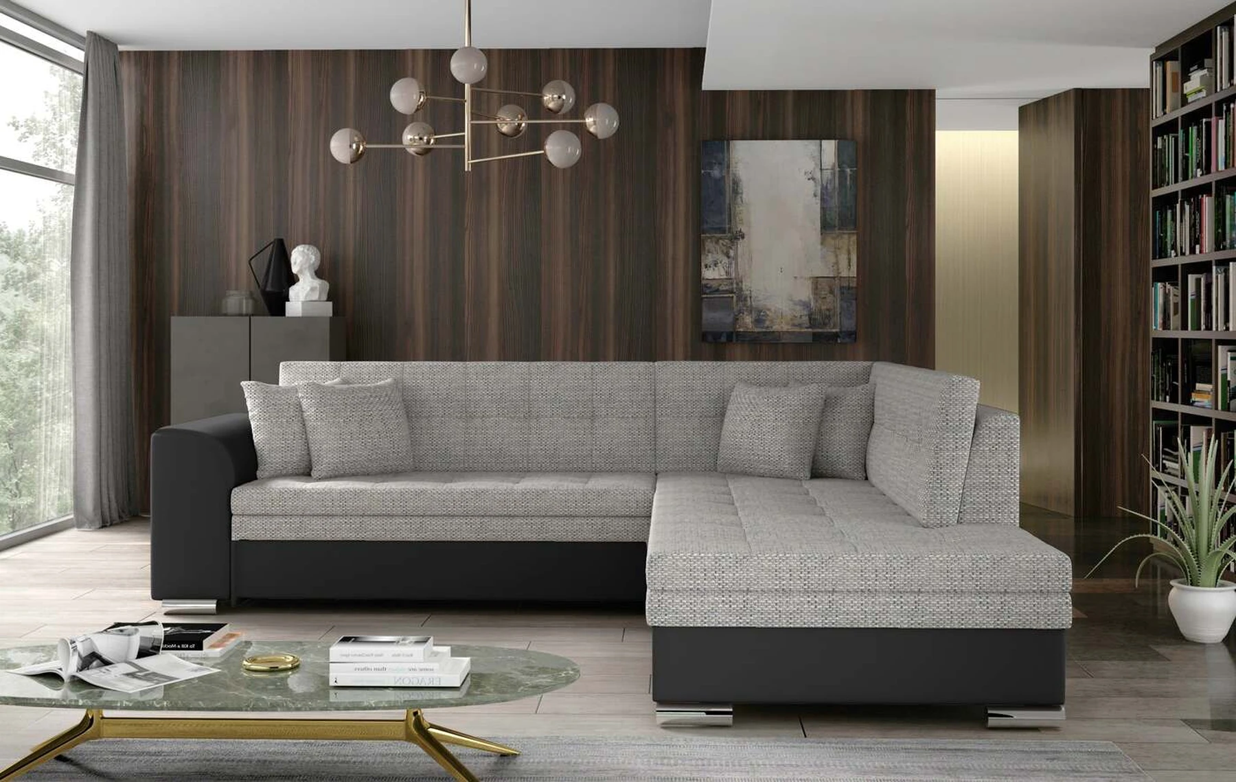 EL4521 yra daugiafunkcinė, tačiau elegantiška ir erdvi klasikinio stiliaus kampinė sofa. Tai aukštos kokybės baldas su plačia sėdyne su užpildu, sukurtu iš gofruotos spyruoklės ir T30 putplasčio derinio. Už EL4521, kurio matmenys 260 x 205 x 80 cm, yra ne tik komfortas, bet ir gerai išmiegotos naktys. per išskirtinai didelį miegamąjį paviršių. Sulankstomas delfinų tipas leidžia lengvai ir be vargo išskleisti sofą, praturtindama ją erdvios lovos, kurios matmenys 200 x 126 cm, funkcija. Didžiausią jaučiamo komforto efektą, be kita ko, įtakoja minkšta, pasvirusi sėdynė. kontūruotas porankis, didelės pagalvėlės įtrauktos į komplektą, taip pat chromuotos ovalios kojos ir kontūrinis atlošas su elegantiška skiautine. Jei smalsu, ką dar gali pasiūlyti kampinė sofa EL4521 – drąsiai rinkitės baldą.