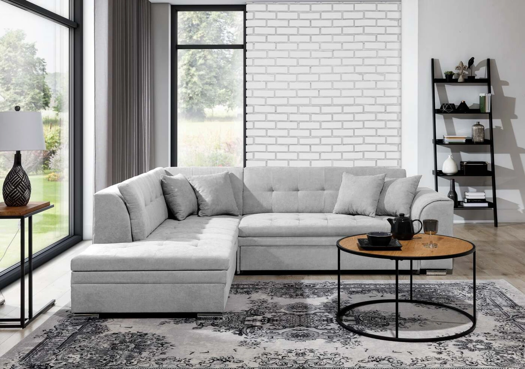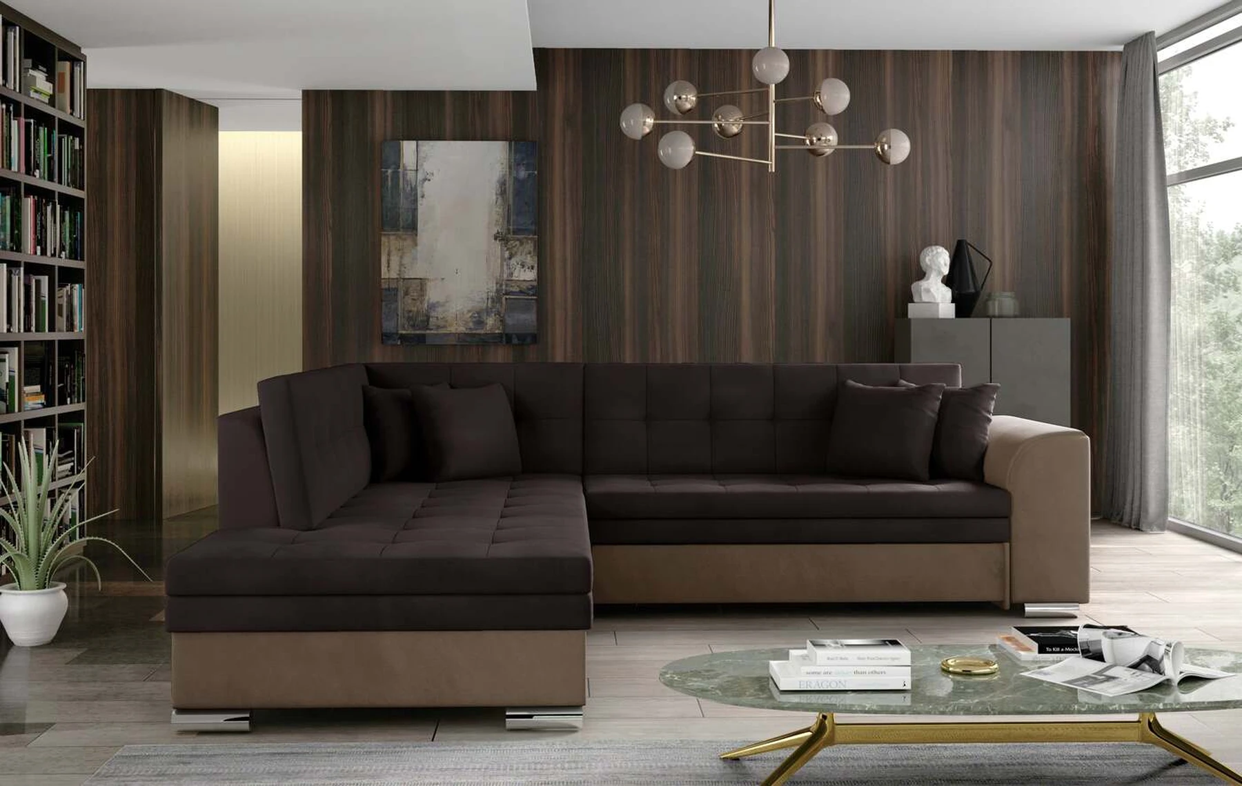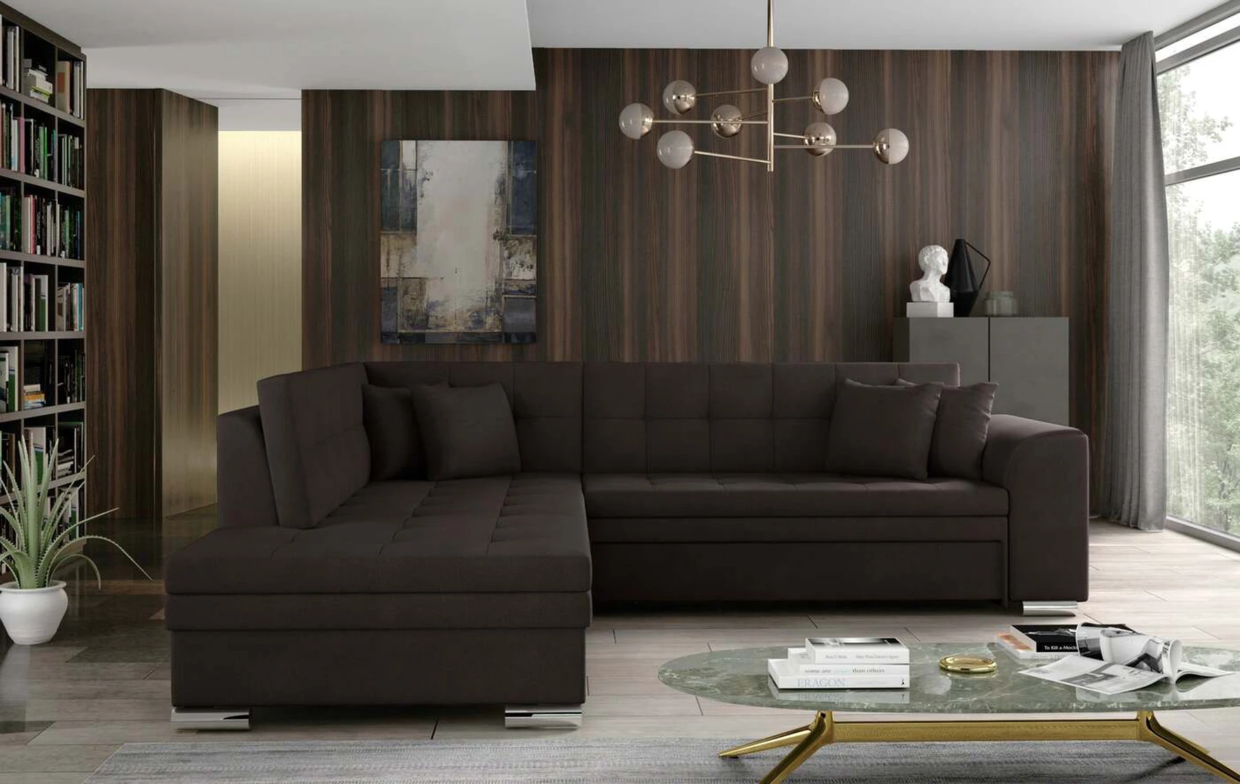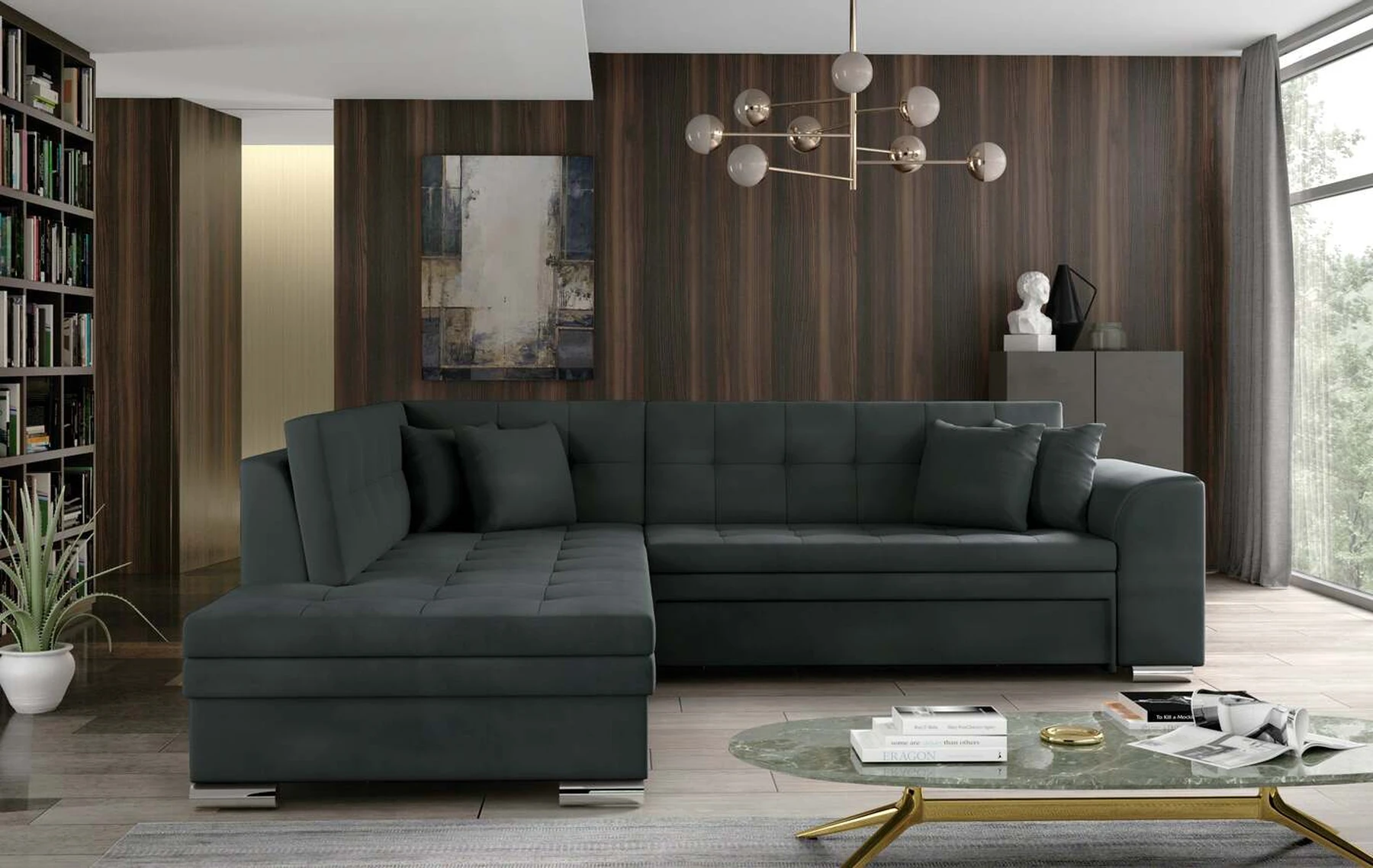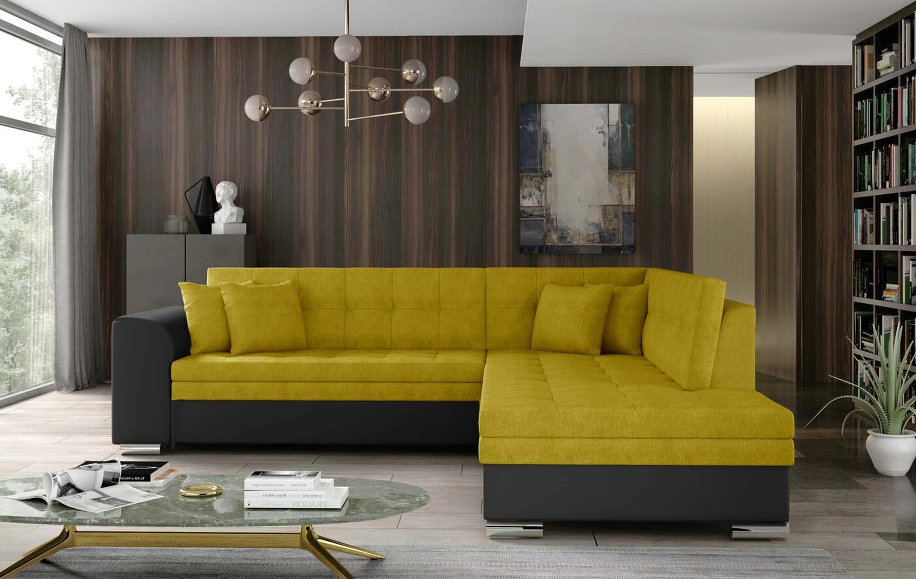 EL4521 yra daugiafunkcinė, tačiau elegantiška ir erdvi klasikinio stiliaus kampinė sofa. Tai aukštos kokybės baldas su plačia sėdyne su užpildu, sukurtu iš gofruotos spyruoklės ir T30 putplasčio derinio. Už EL4521, kurio matmenys 260 x 205 x 80 cm, yra ne tik komfortas, bet ir gerai išmiegotos naktys. per išskirtinai didelį miegamąjį paviršių. Sulankstomas delfinų tipas leidžia lengvai ir be vargo išskleisti sofą, praturtindama ją erdvios lovos, kurios matmenys 200 x 126 cm, funkcija. Didžiausią jaučiamo komforto efektą, be kita ko, įtakoja minkšta, pasvirusi sėdynė. kontūruotas porankis, didelės pagalvėlės įtrauktos į komplektą, taip pat chromuotos ovalios kojos ir kontūrinis atlošas su elegantiška skiautine. Jei smalsu, ką dar gali pasiūlyti kampinė sofa EL4521 – drąsiai rinkitės baldą.