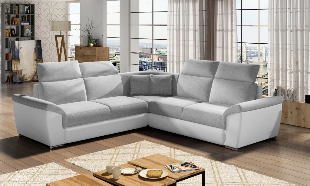 Minkštas kampas su miegama dalimi ir patalynės dėže, kai svetainėje norisi paprastumo