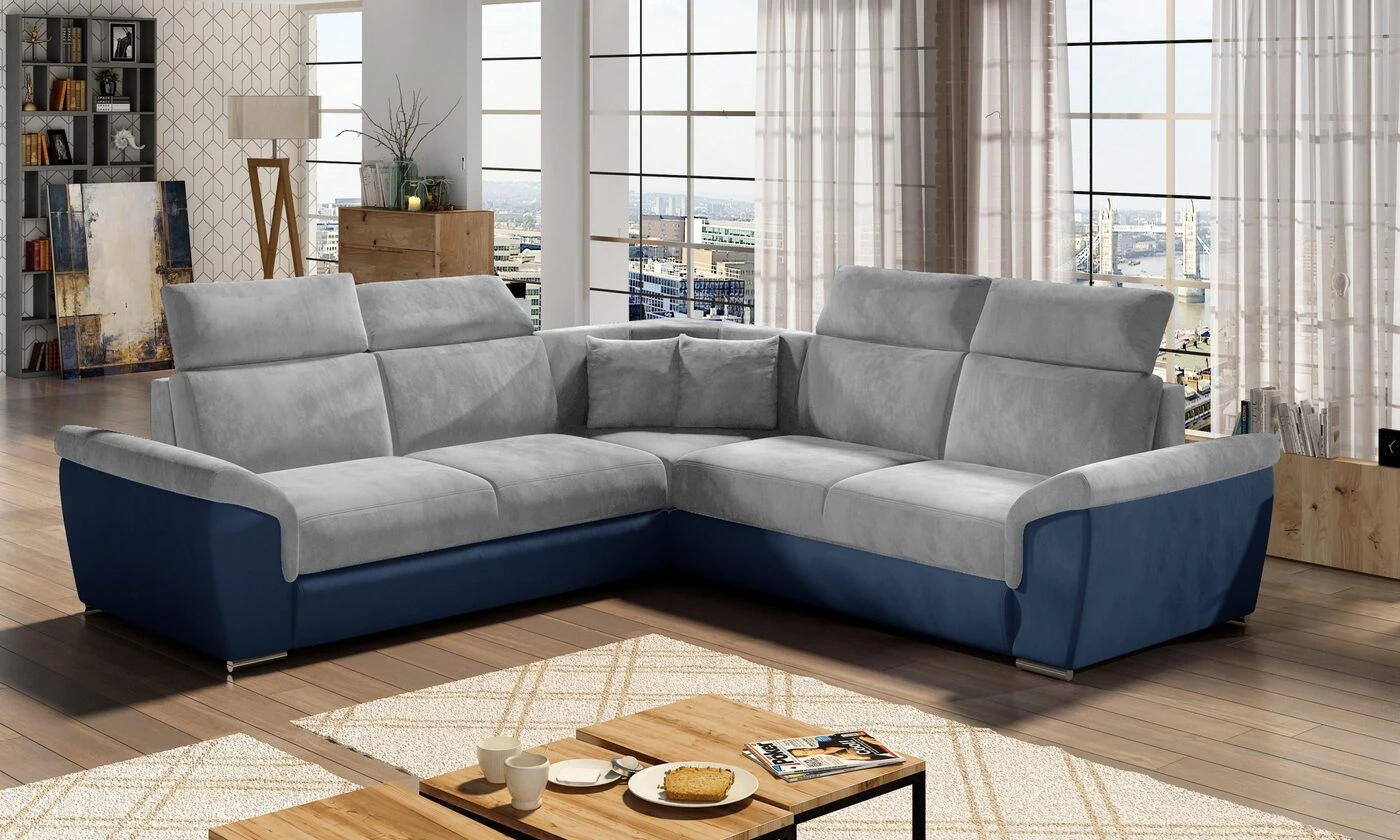 Minkštas kampas su miegama dalimi ir patalynės dėže, kai svetainėje norisi paprastumo