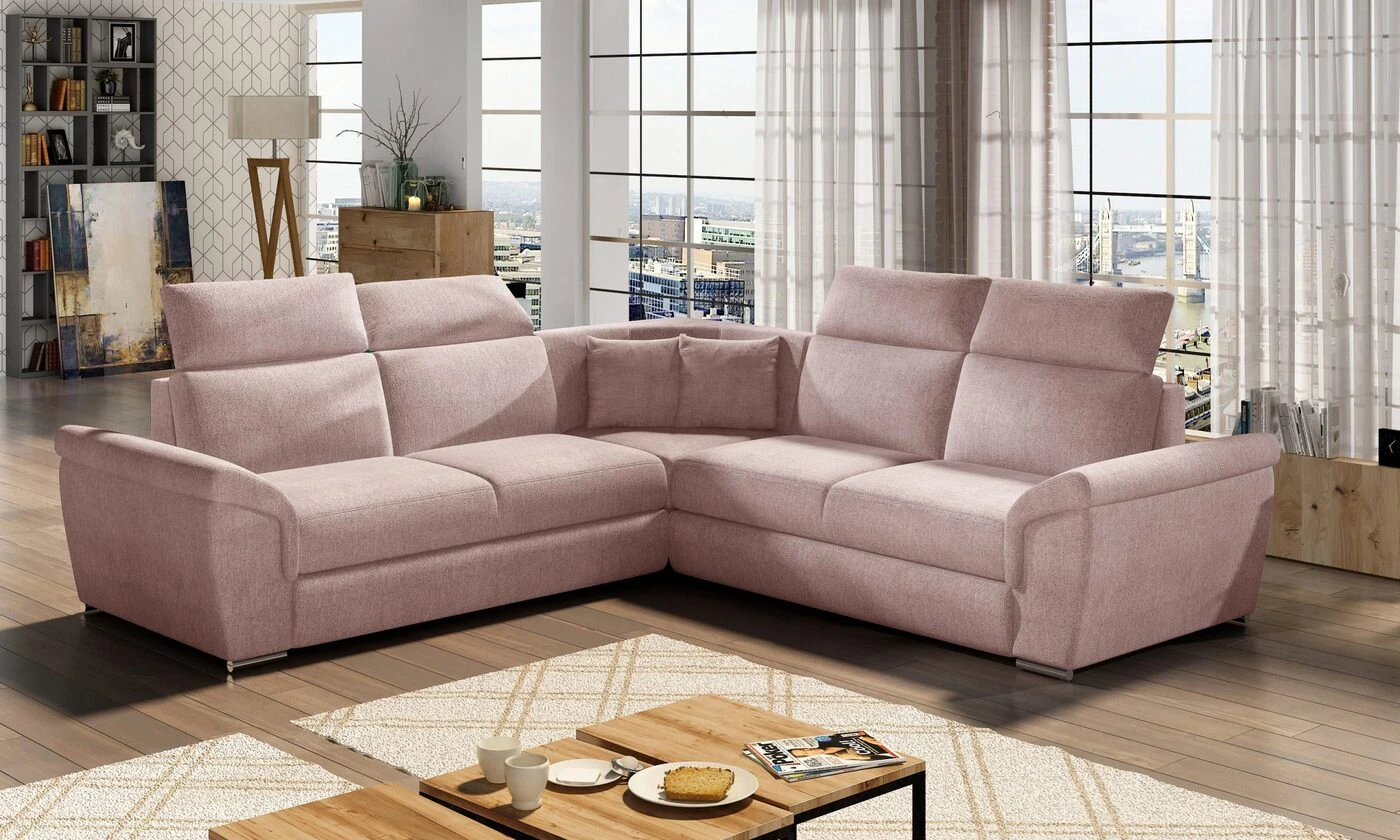 Minkštas kampas su miegama dalimi ir patalynės dėže, kai svetainėje norisi paprastumo