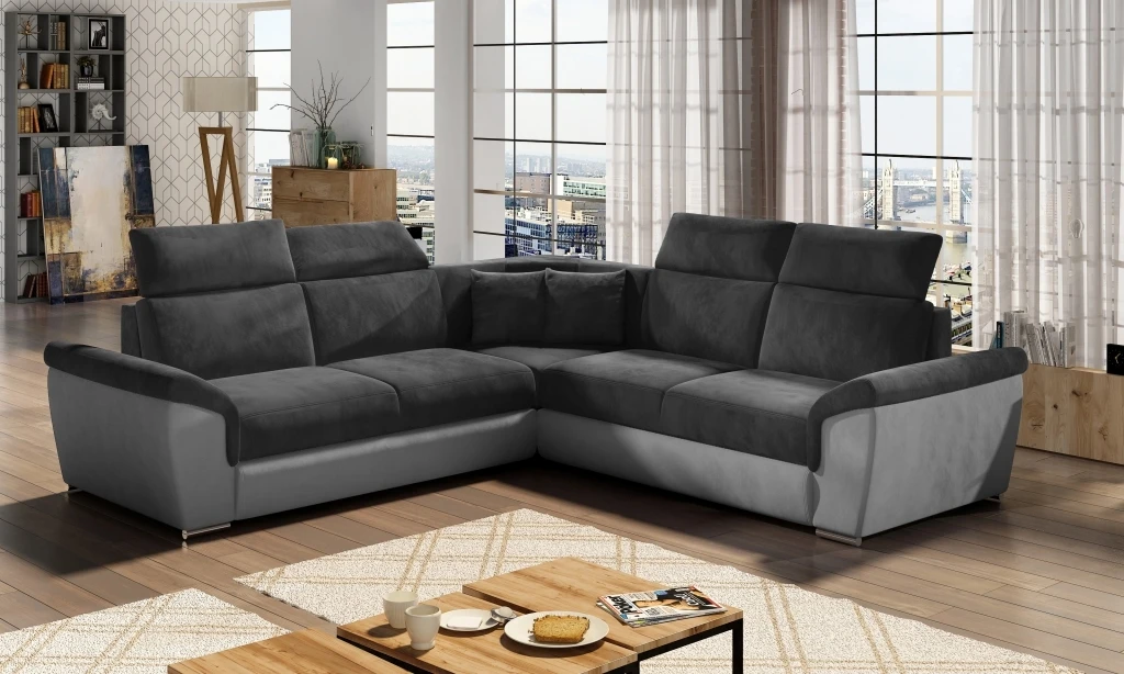 Minkštas kampas su miegama dalimi ir patalynės dėže, kai svetainėje norisi paprastumo
