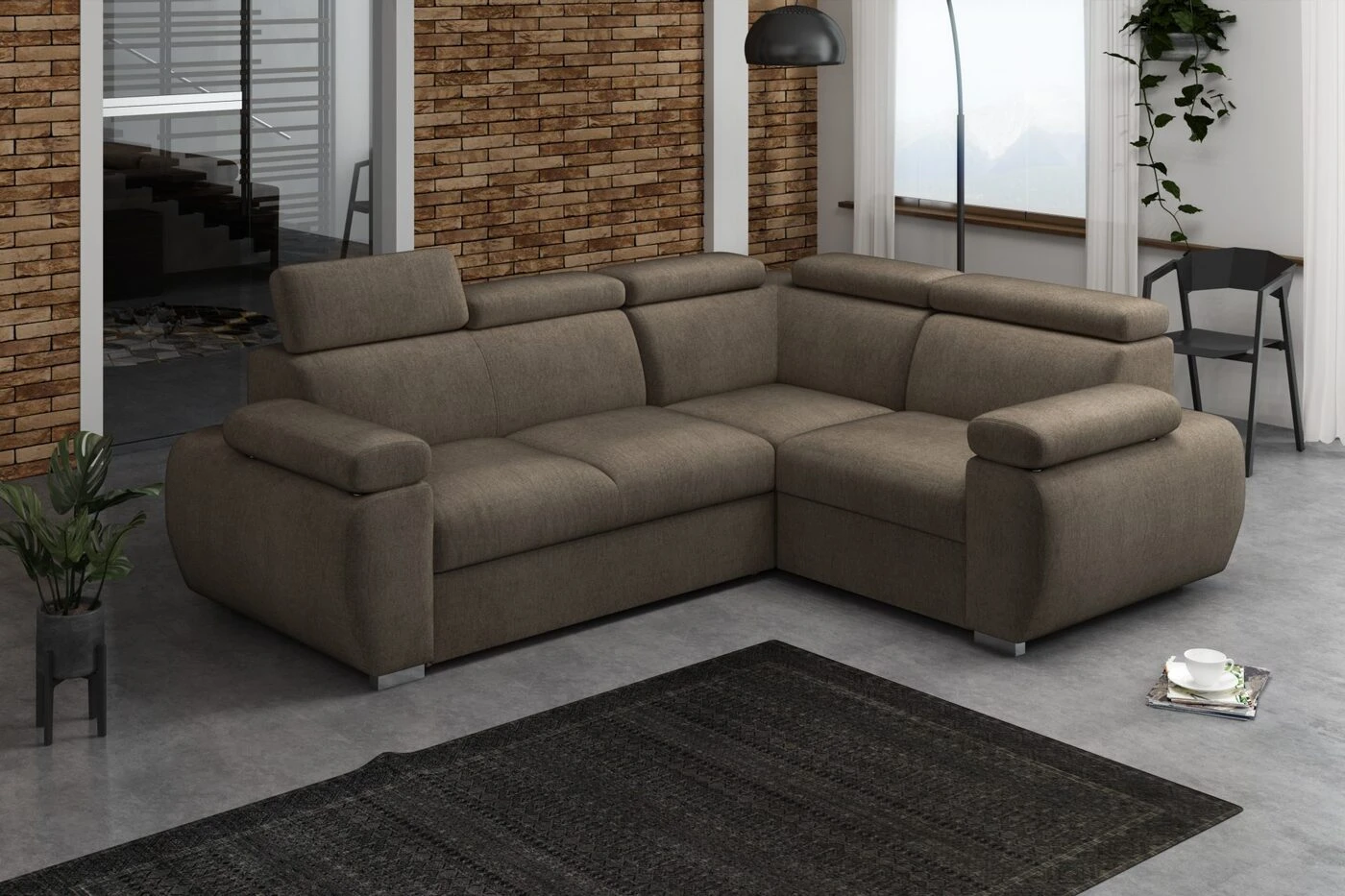 Solidaus stiliaus minkštas kampas BOSTON lengvai priderinamas prie įvairiausių interjerų, o papildomo komforto ir jaukumo šiam baldui suteikia į komplektą įeinančios didelės pagalvės atliekančios atlošo funkciją. Šis minkštas baldas lengvai transformuojamas į miegamąją lovą, kurioje patogiai išsimiegos keli asmenys, o patalynę galėsite laikyti tam skirtoje dėžėje su ištraukiamu mechanizmu. Kampo surinkimo metu galėsite pasirinkti kairinį arba dešininį baldo pastatymo variantą.