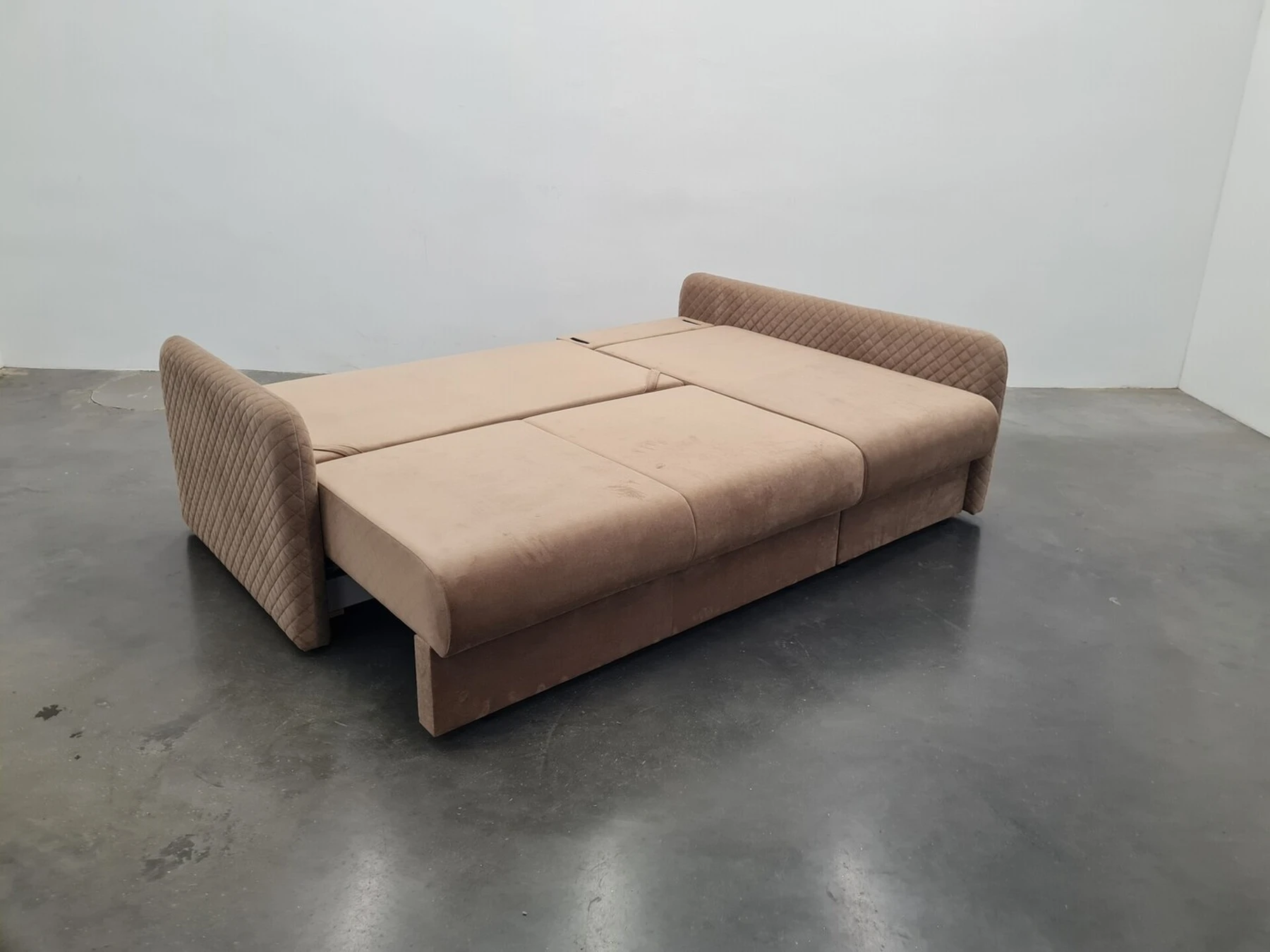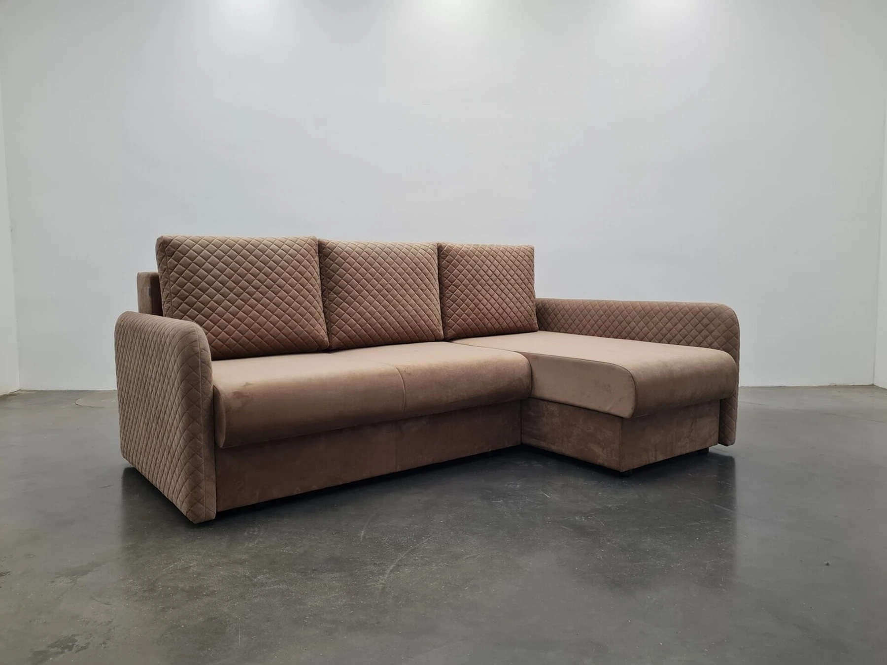 CASA Stone - minkštas ir švelnus, tamsiai smėlinės spalvos veliūrinio tipo audinys. Atraminės atlošo pagalvės dygsniuotos smulkių kvadratų raštu