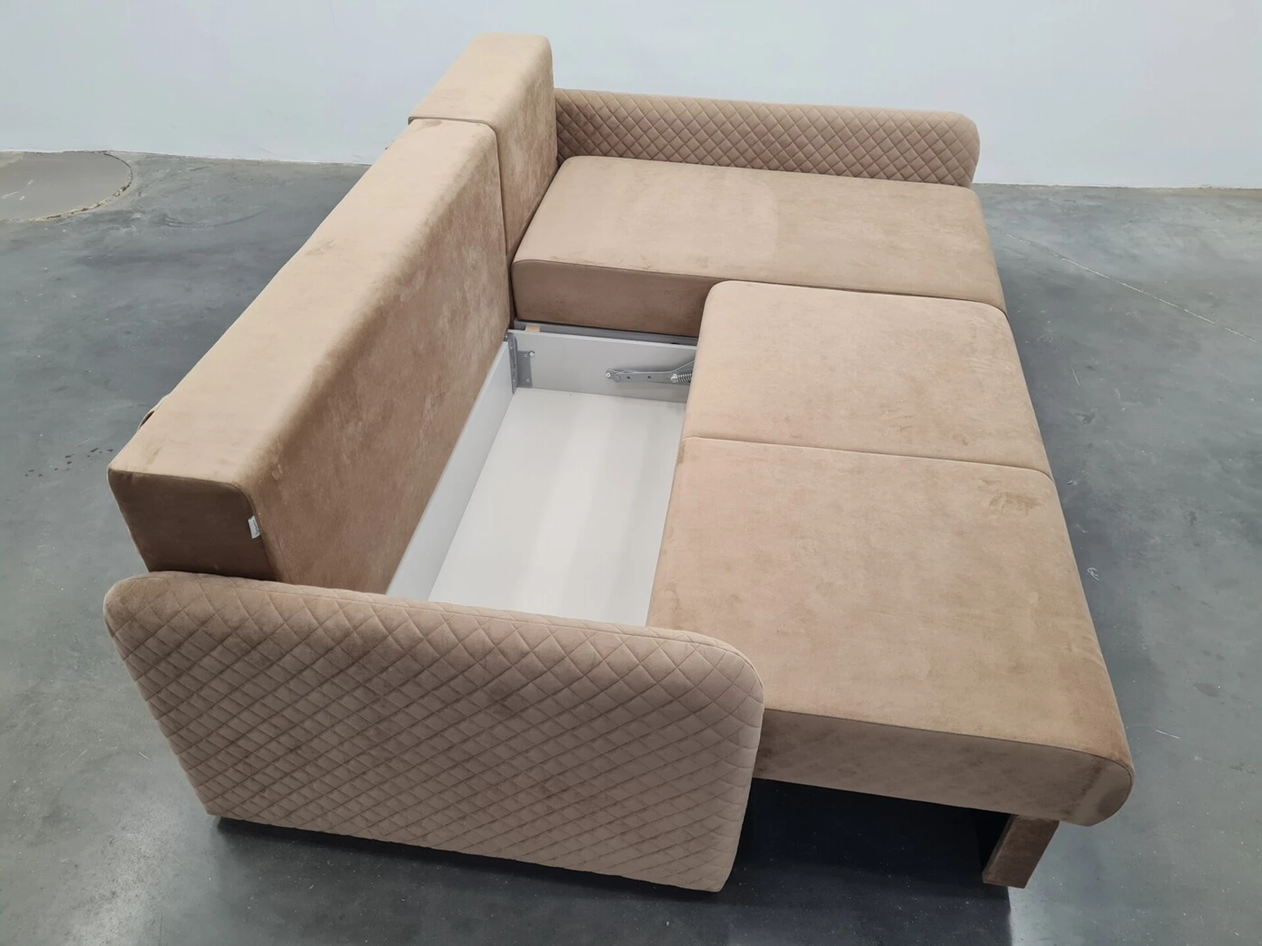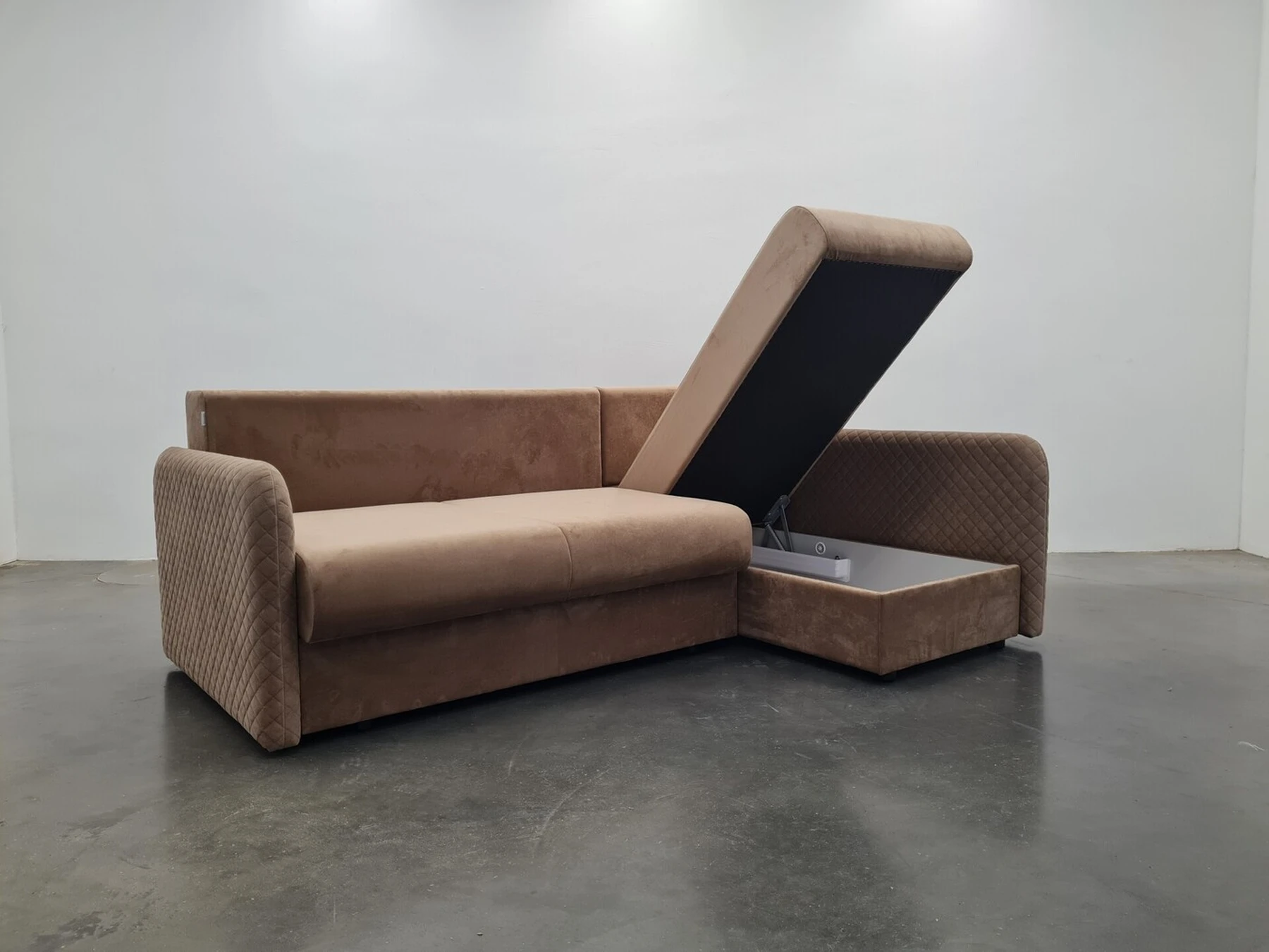 Minkštas kampas su miegamu mechanizmu, dviem patalynės dėžėmis, trimis atlošo pagalvėmis ir minkštais apvalintais 10 cm pločio porankiais