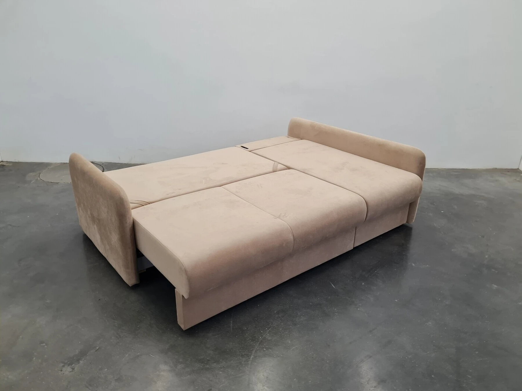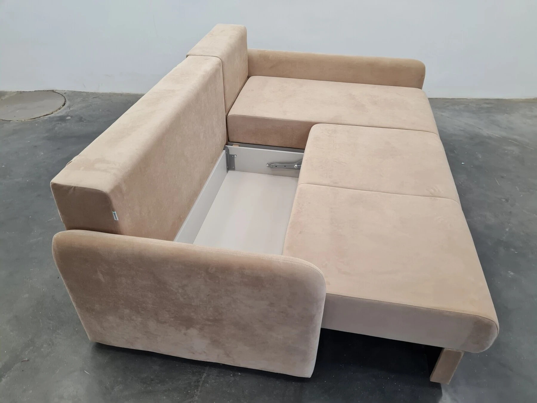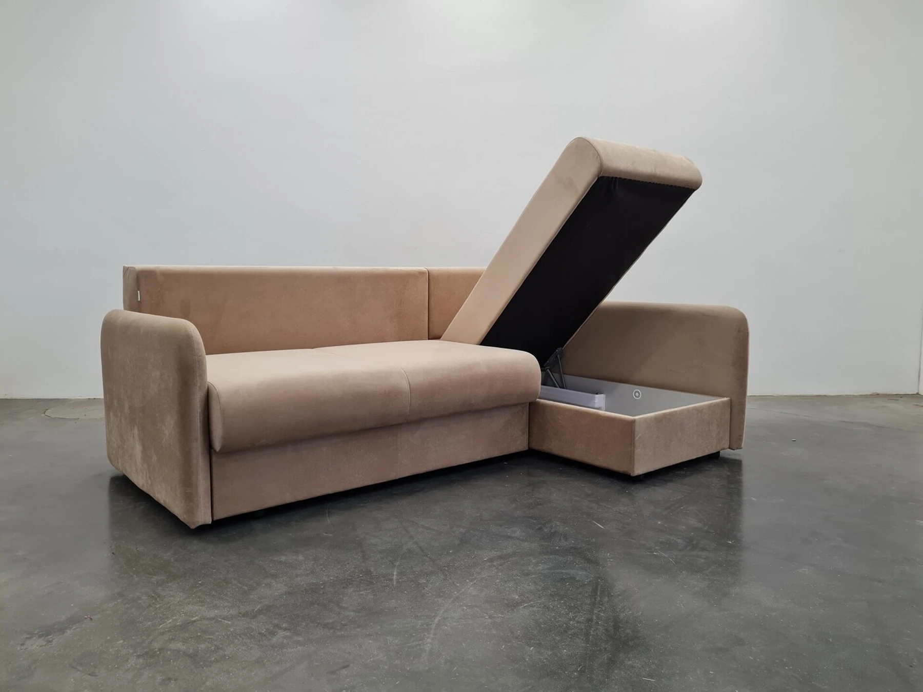 Minkštas kampas su miegamu mechanizmu, dviem patalynės dėžėmis, trimis atlošo pagalvėmis ir minkštais apvalintais 10 cm pločio porankiais