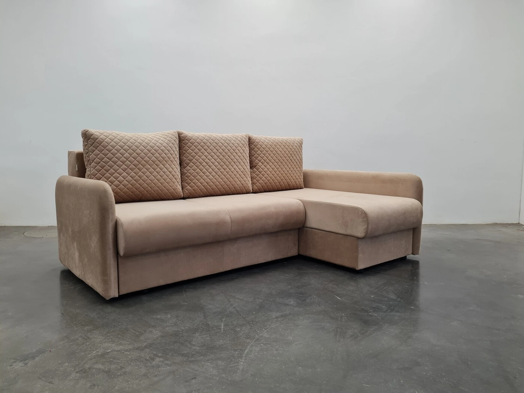 CASA Beige - minkštas ir švelnus, smėlinės spalvos veliūrinio tipo audinys. Atraminės atlošo pagalvės dygsniuotos smulkių kvadratų raštu