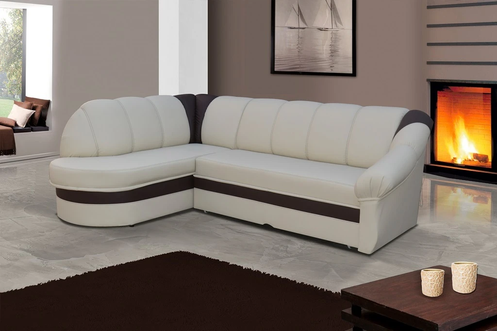Minkštas kampas su miegama dalimi ir patalynės dėže, kai svetainėje norisi paprastumo