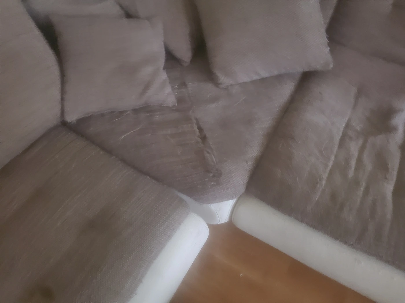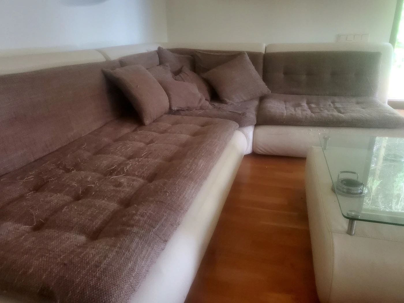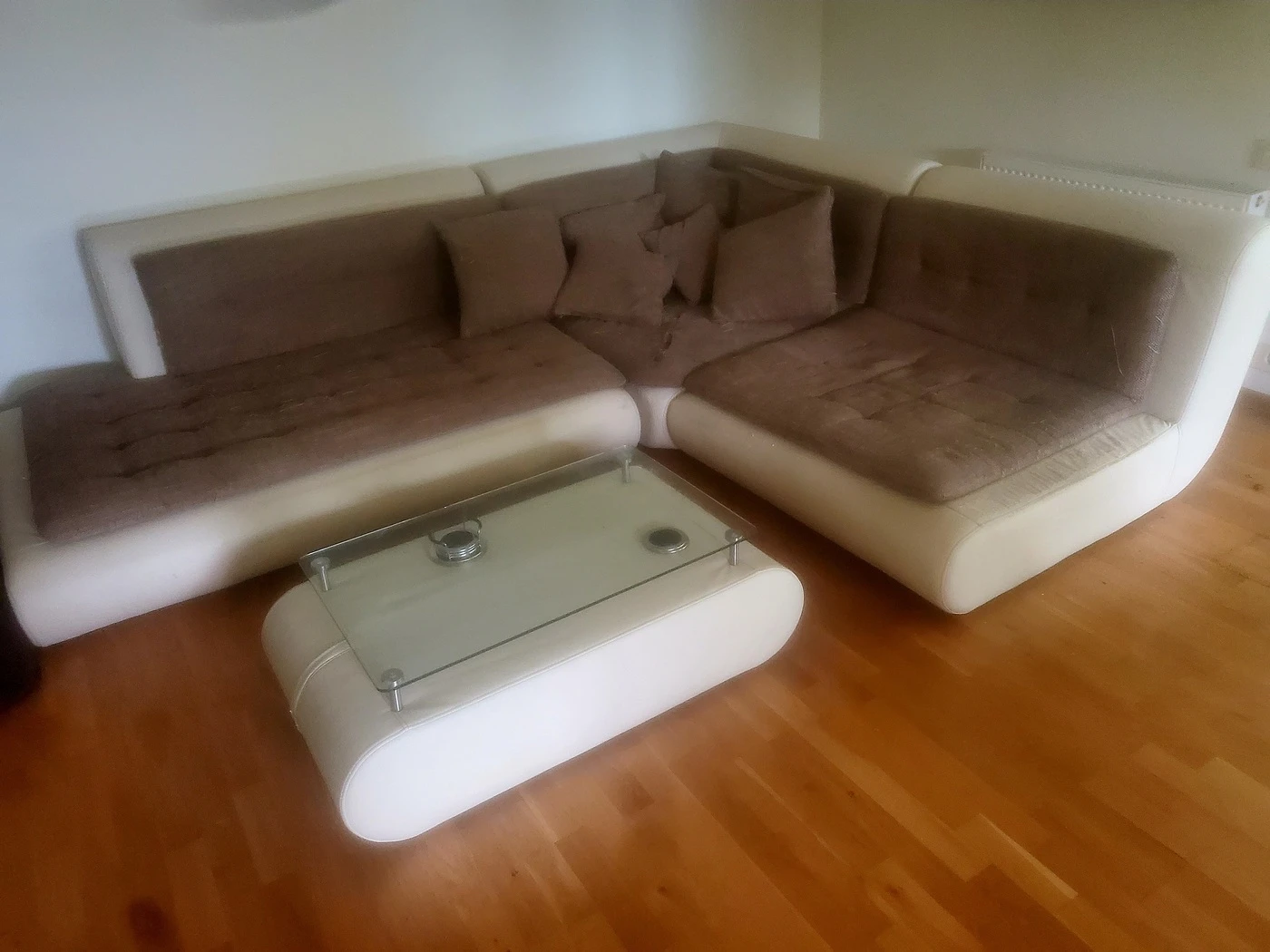 Eko odos ir gobeleno minkštas kampas ir eko odos kavos staliukas su stiklu. Kampas sudarytas iš trijų atskirų dalių, todėl gali būti išdėstymas ir dalimis jei reikia. Baldai reikalauja pervilikimo. Labai patogus kampas, kuris, pakeitus gobeleną, dar tikrai ilgai tarnaus.
