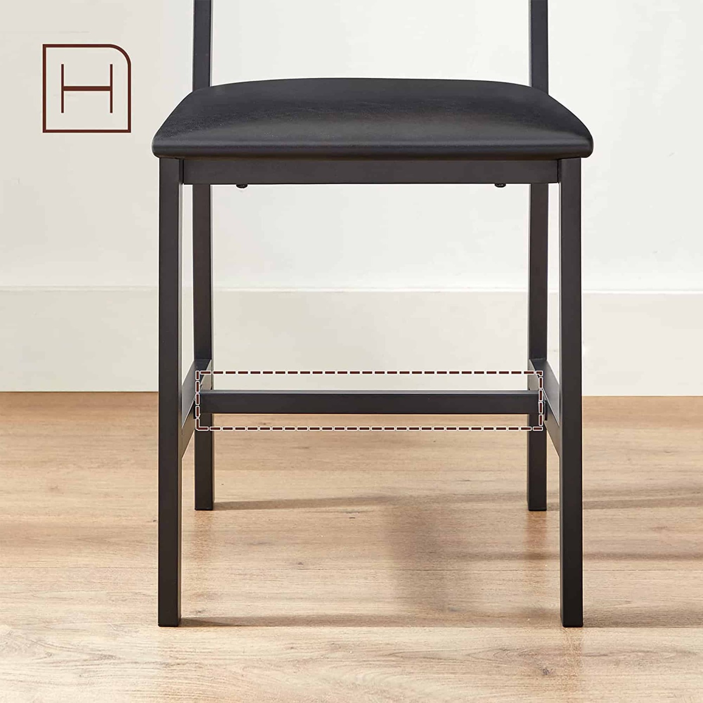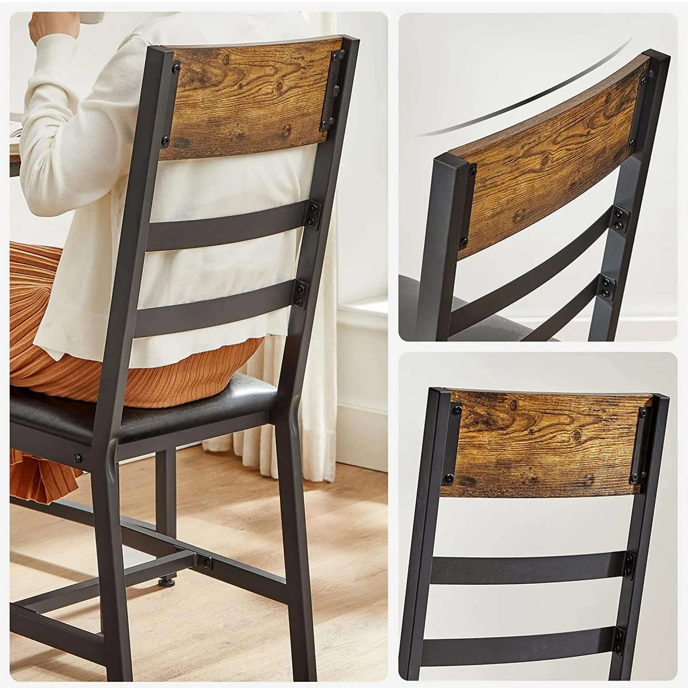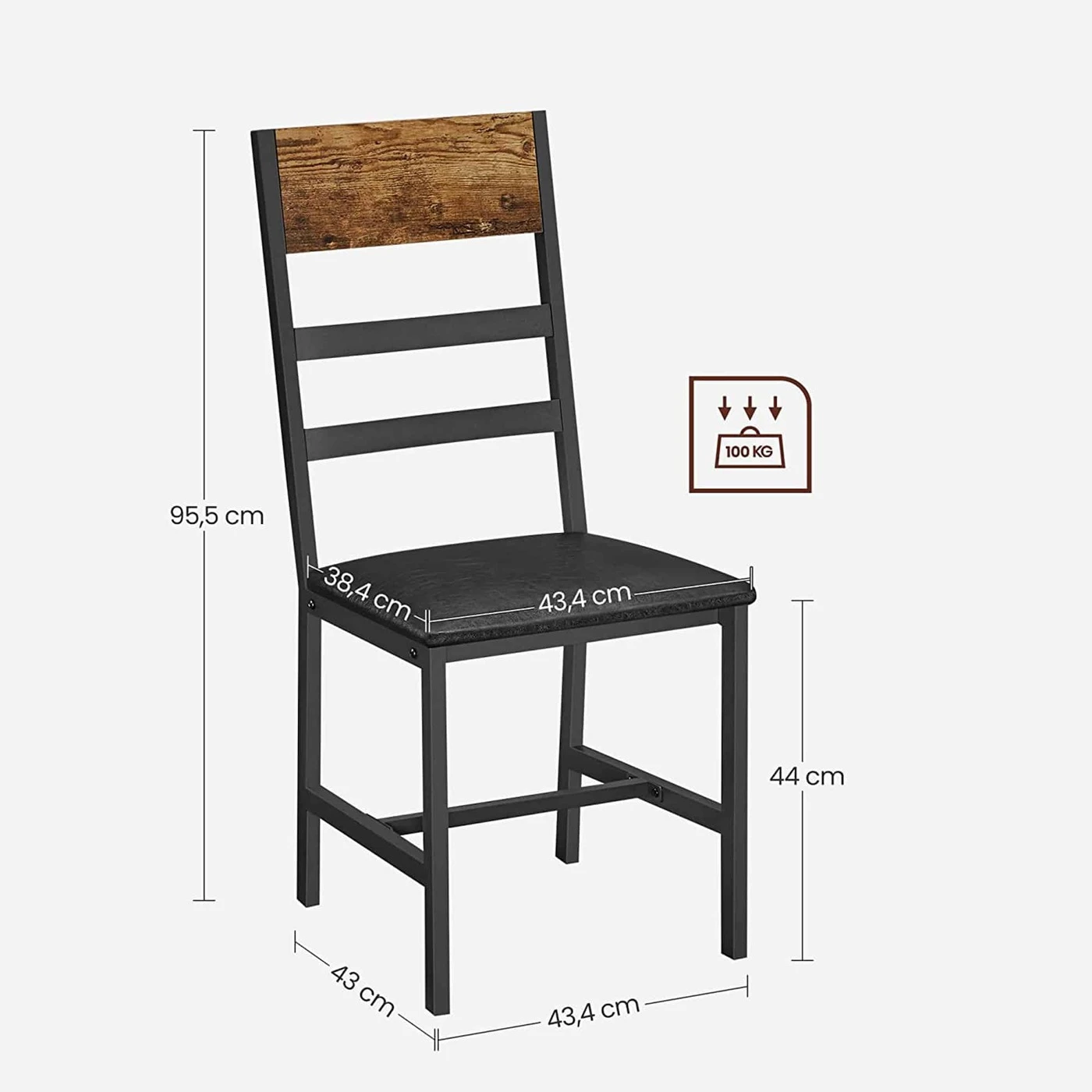 Aprašymas buvo automatiškai išverstas, gali pasitaikyti klaidų.Išsami informacija apie gaminį: - Spalva: vintažinė ruda-juoda - Medžiaga: medžio drožlių plokštės, plienas, putplastis - Bendras kėdės dydis: 43,4 x 43 x 95,5 cm (I x P x A) - Sėdynės dydis: 43,4 x 38 4 cm (P x P) - Sėdynės aukštis: 44 cm - Bendras svoris: 11,2 kg - Maksimali statinė apkrova vienai kėdei: 100 kg Pakuotės turinys: - 2 x valgomojo kėdė - 1 x priedų paketas - 1 x instrukcijosVASAGLE Pastabos:- Saugumo sumetimais vaikams neleidžiama laipioti ar žaisti su gaminiu.- Maksimali vienos kėdės statinė apkrova yra 100 kg. Prašome neviršyti šio didžiausio svorio.