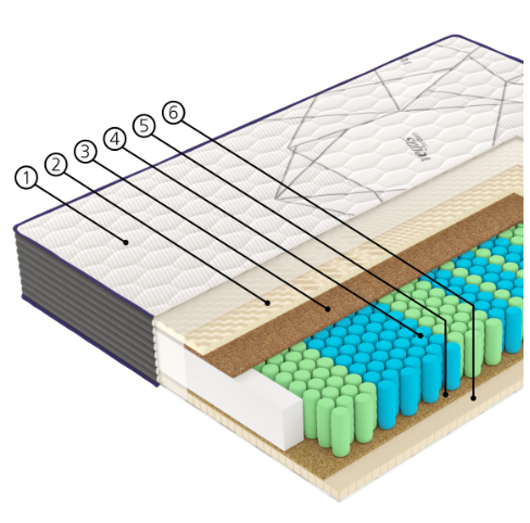 3. Kokoso pluoštas – natūrali medžiaga iš presuoto kokoso riešutų pluošto, įmirkyto lateksu. Naudojama siekiant suteikti čiužiniui kietumo.