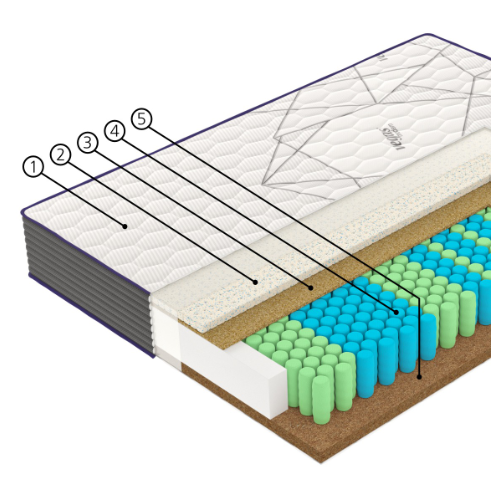 5. Kokoso pluoštas – natūrali medžiaga iš presuoto kokoso riešutų pluošto, įmirkyto lateksu. Naudojama siekiant suteikti čiužiniui kietumo.