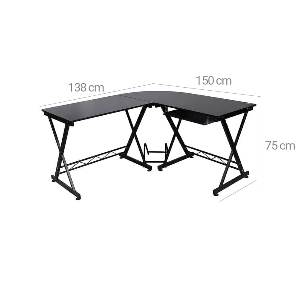 Aprašymas buvo automatiškai išverstas, gali pasitaikyti klaidų.Išnaudokite visas savo namų biuro galimybesNors šis kampinis stalas užima daug vietos, jam tikrai netrūksta vietos. Pavyzdžiui, vienoje pusėje padėkite monitorių, o kitoje – nešiojamąjį kompiuterį. Be to, yra klaviatūros dėklas ir atskiras stovas, leidžiantis patogiai pasidėti procesoriaus bokštą po stalu. Nebesikrapštykite Atsisveikinkite su mažais gyvenimo nemalonumais. Reguliuojamos kojelės užtikrina, kad šis kampinis rašomasis stalas būtų stabilus ir nesvirdytų kiekvieną kartą paspaudus mygtuką Išsami informacija apie gaminį: - Spalva: Juoda - Medžiaga: Geležis, medžio drožlių plokštė, melamino danga - Dydis: 150 x 138 x 75 cm (P x P x A) - Stalviršio storis: 1,5 cm- Svoris: 26,8 kgPristatymo komplektacija: - 1 x kampinis rašomasis stalas - 1 x priedų paketas - 1 x vadovas (DE, ES, EN, FR, IT) SONGMICS Pastabos: - Šis stalas buvo skirtas tik darbui ar studijoms. Prašau nesėdėkite ir nestovėkite ant stalo.