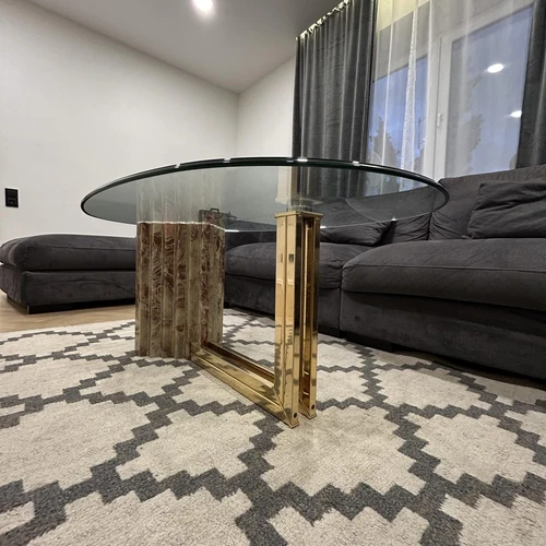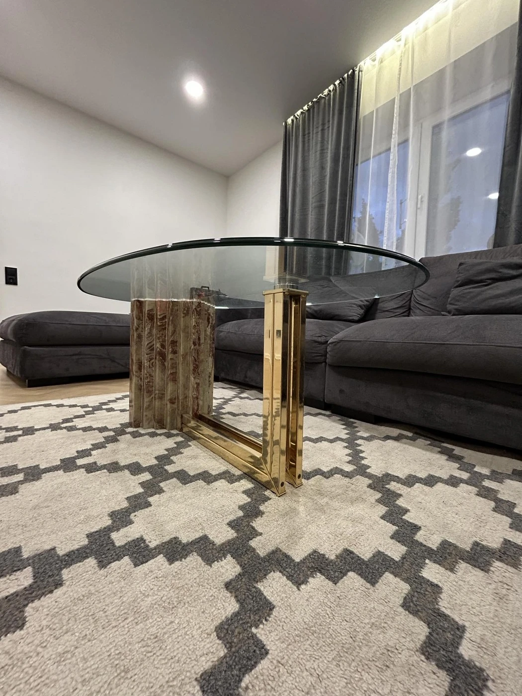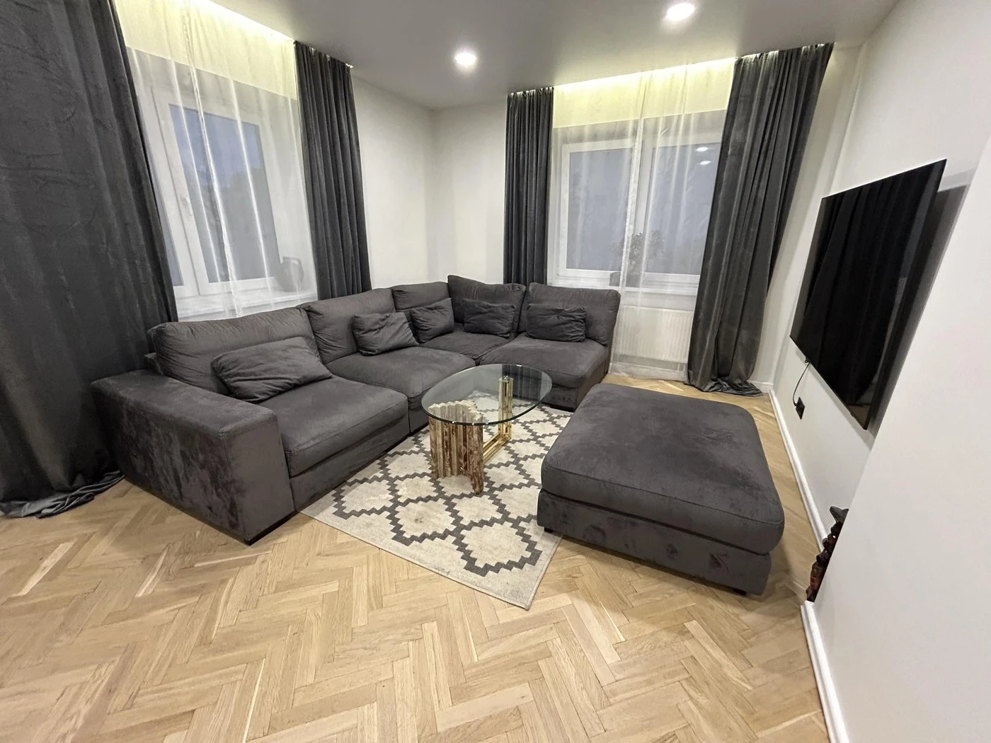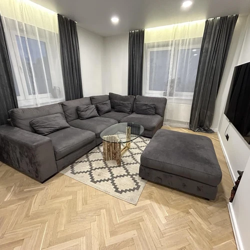 .Tamsiai pilko veliūro modulinis sofa-kampas su pufu, neišsiskleidžia. Matmenys: ilgis 330cm, gylis 210/120, sėdima dalis 85cm. Kampas pasidalina į dvi dalis. Pufo matmenys: 90x120cm.