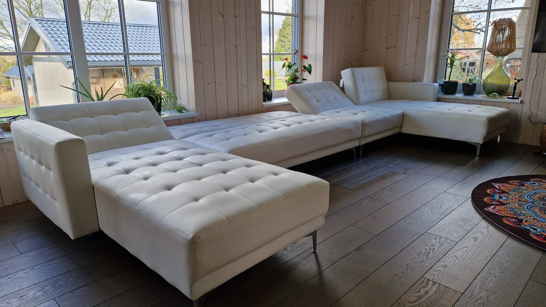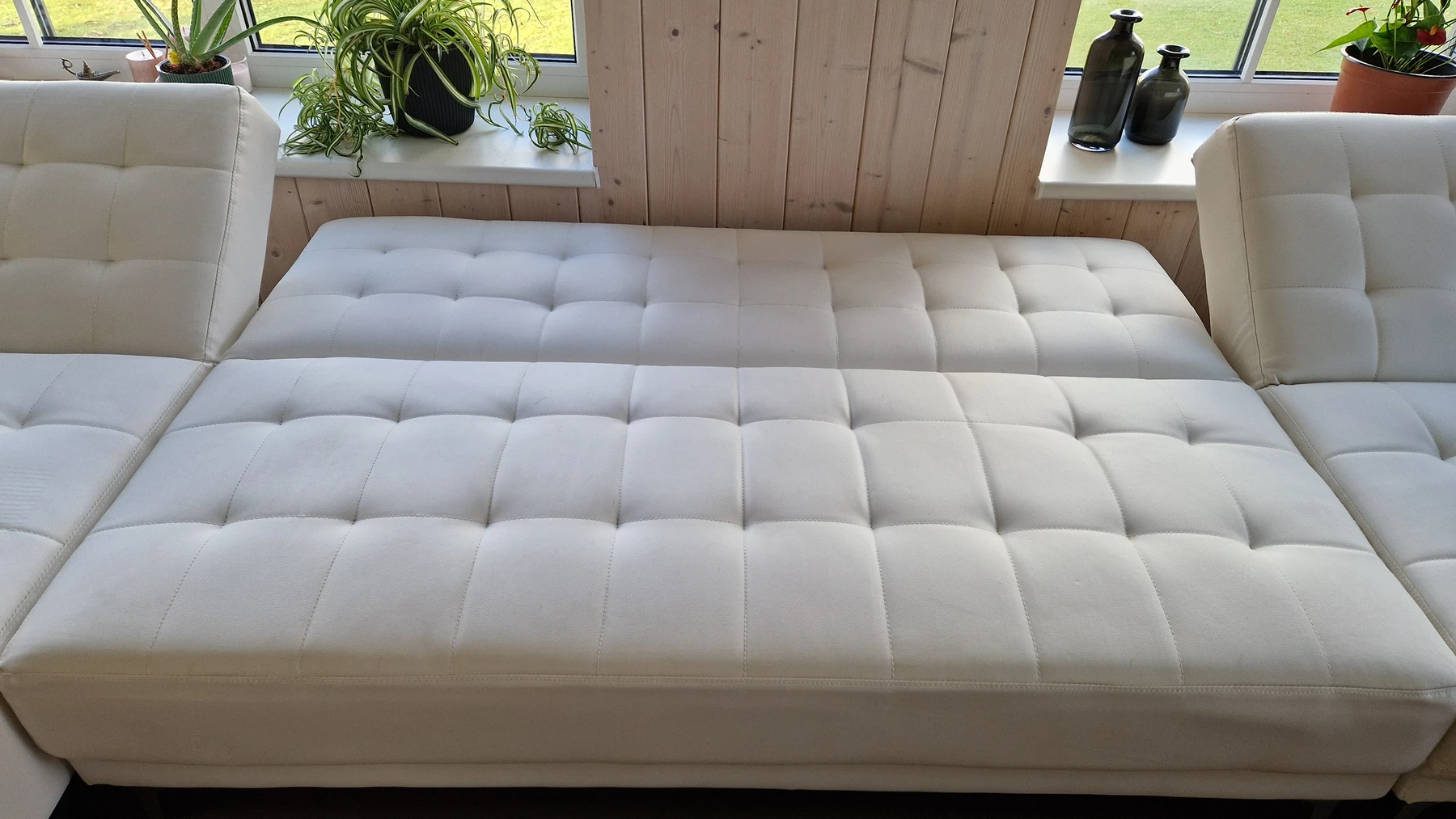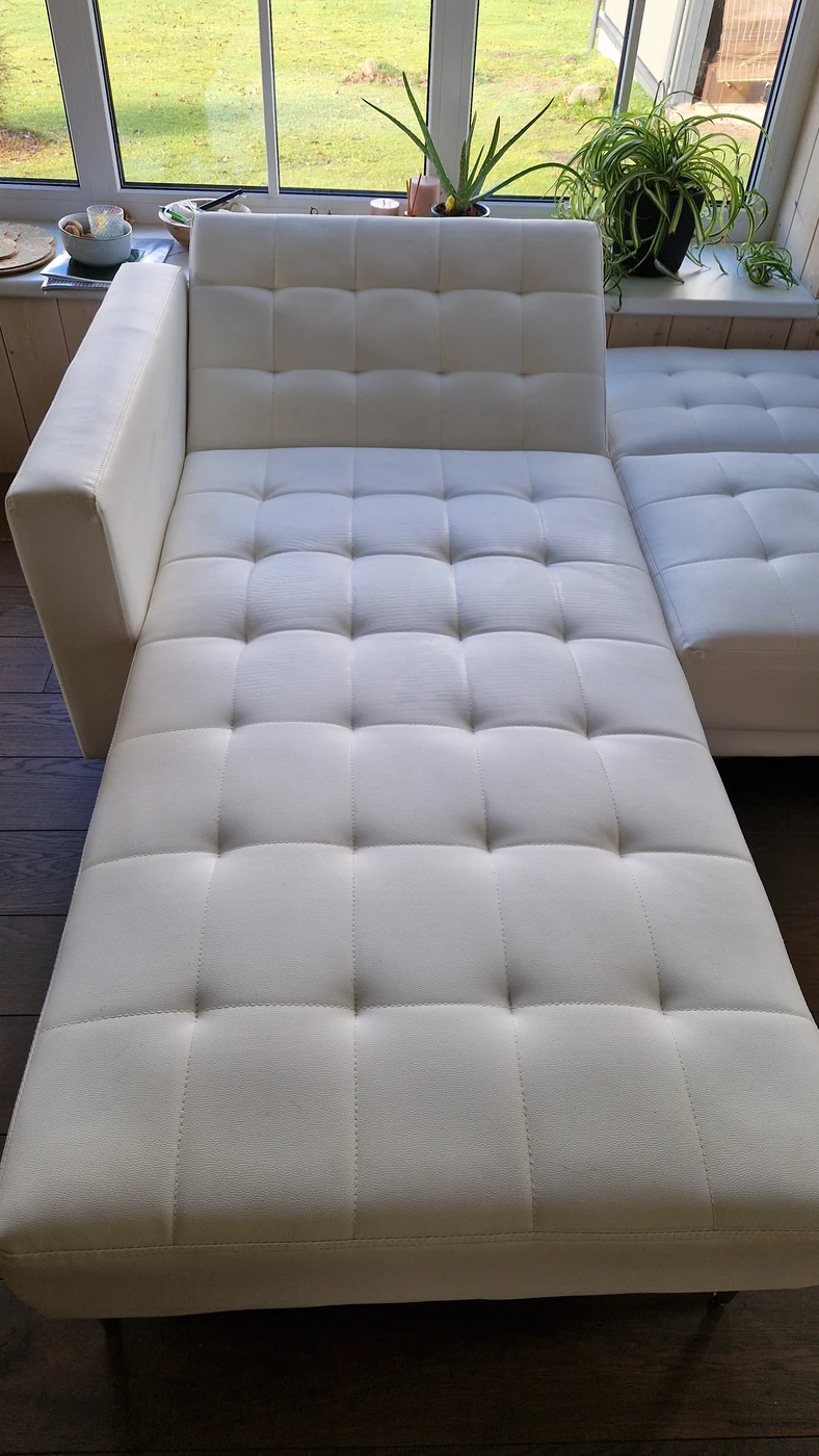 Modulinis minkštas kampas U forma, dirbtinė oda (balta), pusė metų naudota, tvarkingas , be jokių defektų, galima modeliuoti, kaip norisi, sujungtas keturiais blokais, kurie galima išardyti ir susijungti pagal poreikį. Dovanų pridedama dirbtinio kailio užvalkalai.