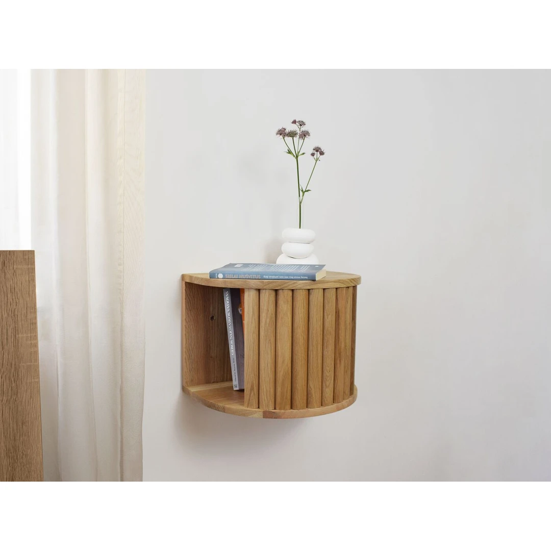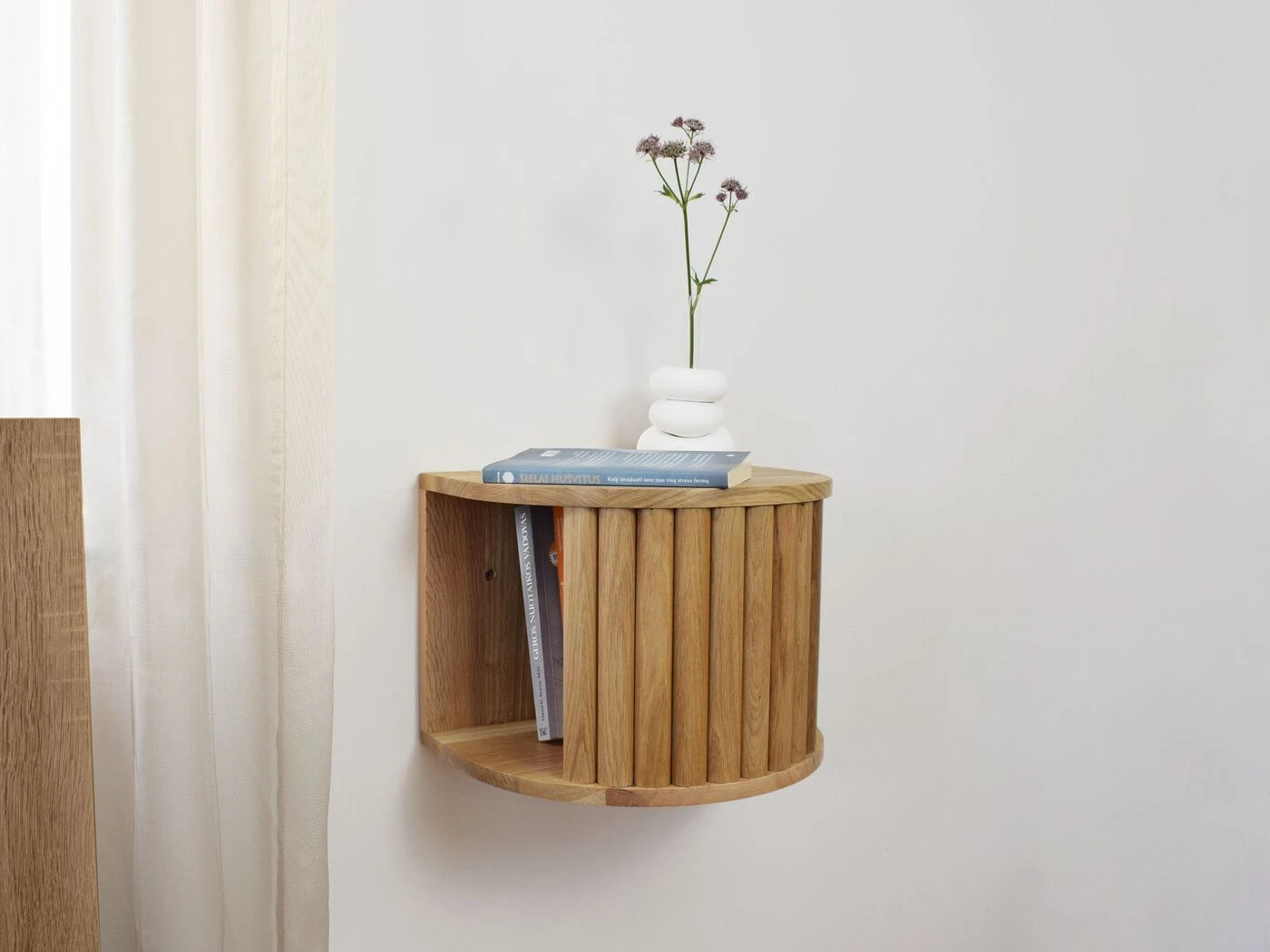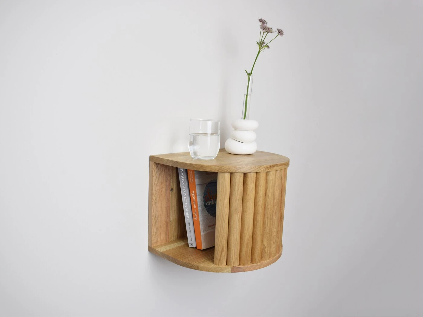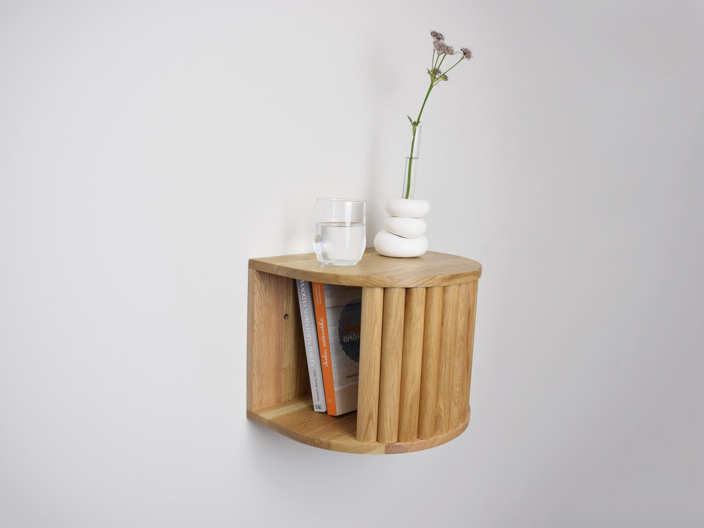 Šis modernus naktinis staliukas pagamintas iš natūralaus ąžuolo. Minimalistinio stiliaus naktinio staliuko viduryje yra paslėpta erdvė, briaunotomis ąžuolinėmis lazdelėmis aptverta erdvė, kurioje galima susidėti įvairius namų apyvokos daiktus. Viršutinis spintelės stalviršis taip pat gali būti naudojamas įvairiems daiktams laikyti. Šis Scandi dizaino plaukiojantis stalas yra funkcionalus ir puikiai papuoš bet kurį jūsų namų kambarį, nesvarbu, ar tai miegamasis, svetainė, prieškambaris ar bet kuri kita jūsų pasirinkta patalpa.