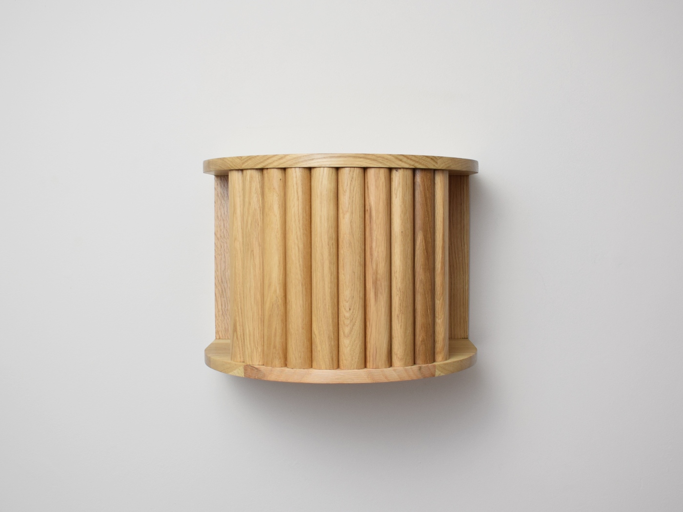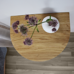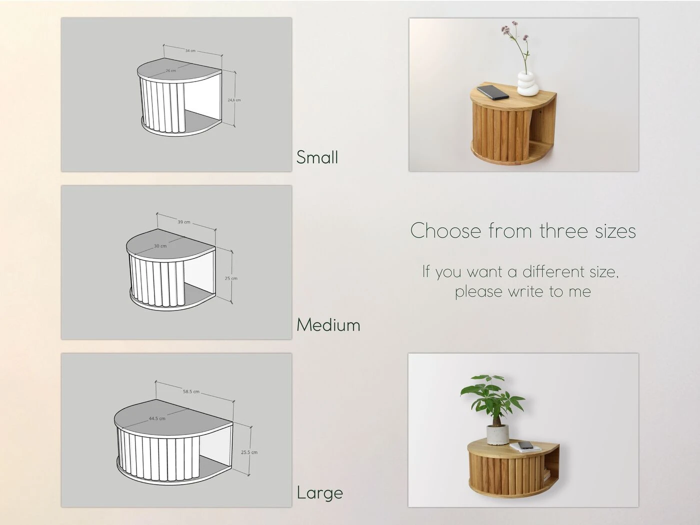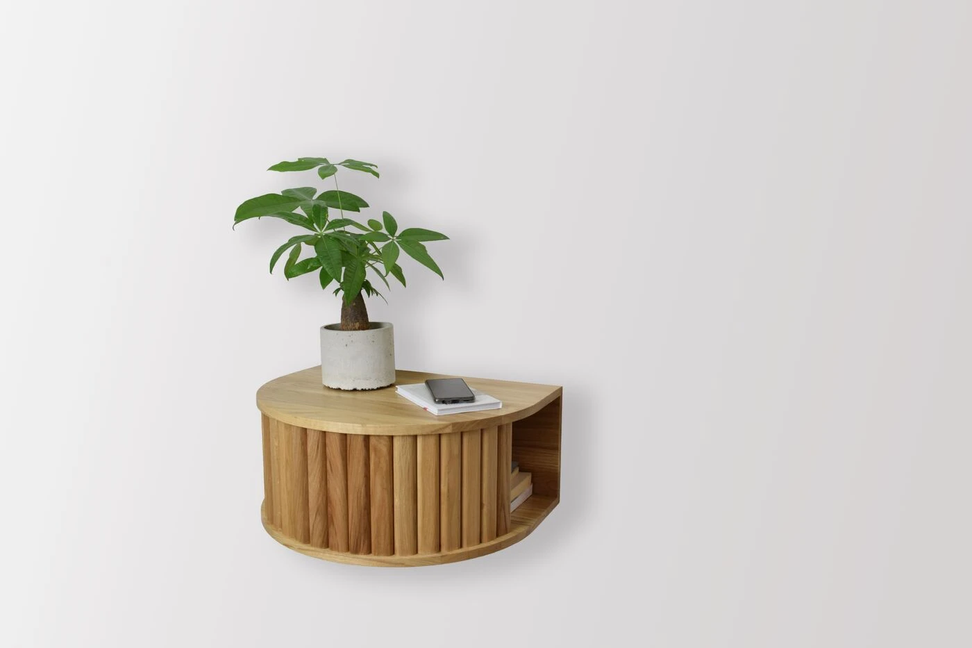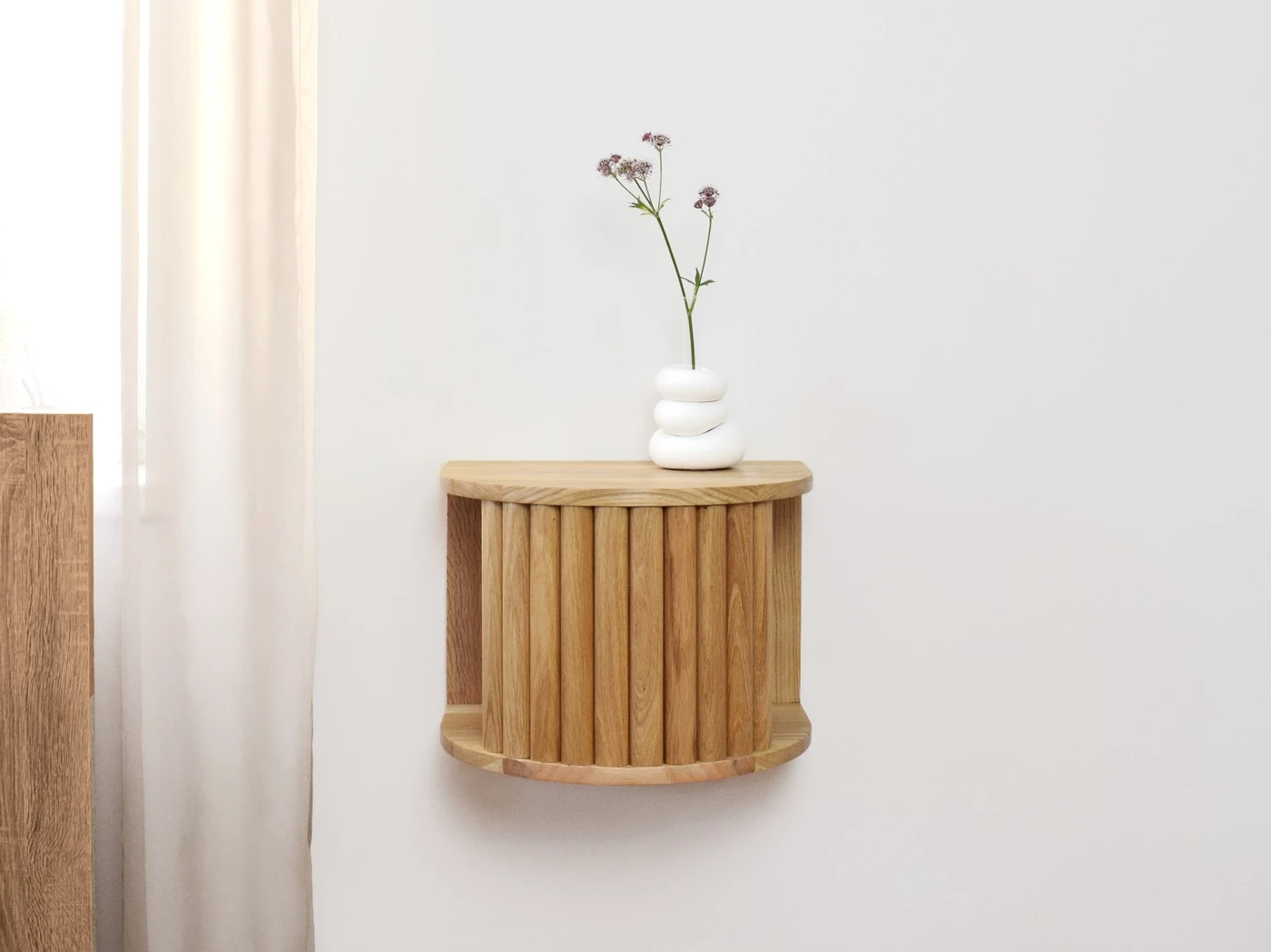 Šis modernus naktinis staliukas pagamintas iš natūralaus ąžuolo. Minimalistinio stiliaus naktinio staliuko viduryje yra paslėpta erdvė, briaunotomis ąžuolinėmis lazdelėmis aptverta erdvė, kurioje galima susidėti įvairius namų apyvokos daiktus. Viršutinis spintelės stalviršis taip pat gali būti naudojamas įvairiems daiktams laikyti. Šis Scandi dizaino plaukiojantis stalas yra funkcionalus ir puikiai papuoš bet kurį jūsų namų kambarį, nesvarbu, ar tai miegamasis, svetainė, prieškambaris ar bet kuri kita jūsų pasirinkta patalpa.
