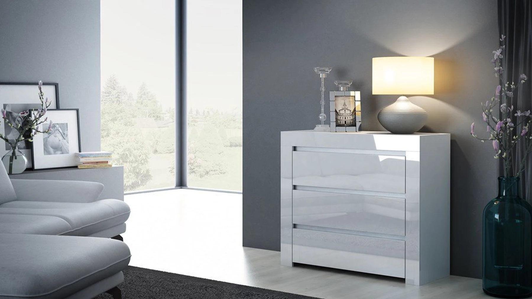 Trijų stalčių naktinė spintelė;Spintelės išmatavimai: aukštis - 79 cm, plotis - 80 cm, gylis - 40 cm;Korpusas pagamintas iš laminuotos medžio drožlių plokštės (MDP);Priekinė spintelės dalis - dengta aukštos kokybės laku, naudojamu apdailai; Lakas - atsparus spalvos pokyčiams, kuriuos sukelia UV spinduliai, todėl paviršių lengva išlaikyti švarų;Spintelės kraštų apdaila - ABS, pasižymintis dideliu mechaniniu bei cheminiu atsparumu;Korpuso spalva - balta; priekinės dalies spalva - blizgi balta;Stalčių bėgeliai ritininiai;