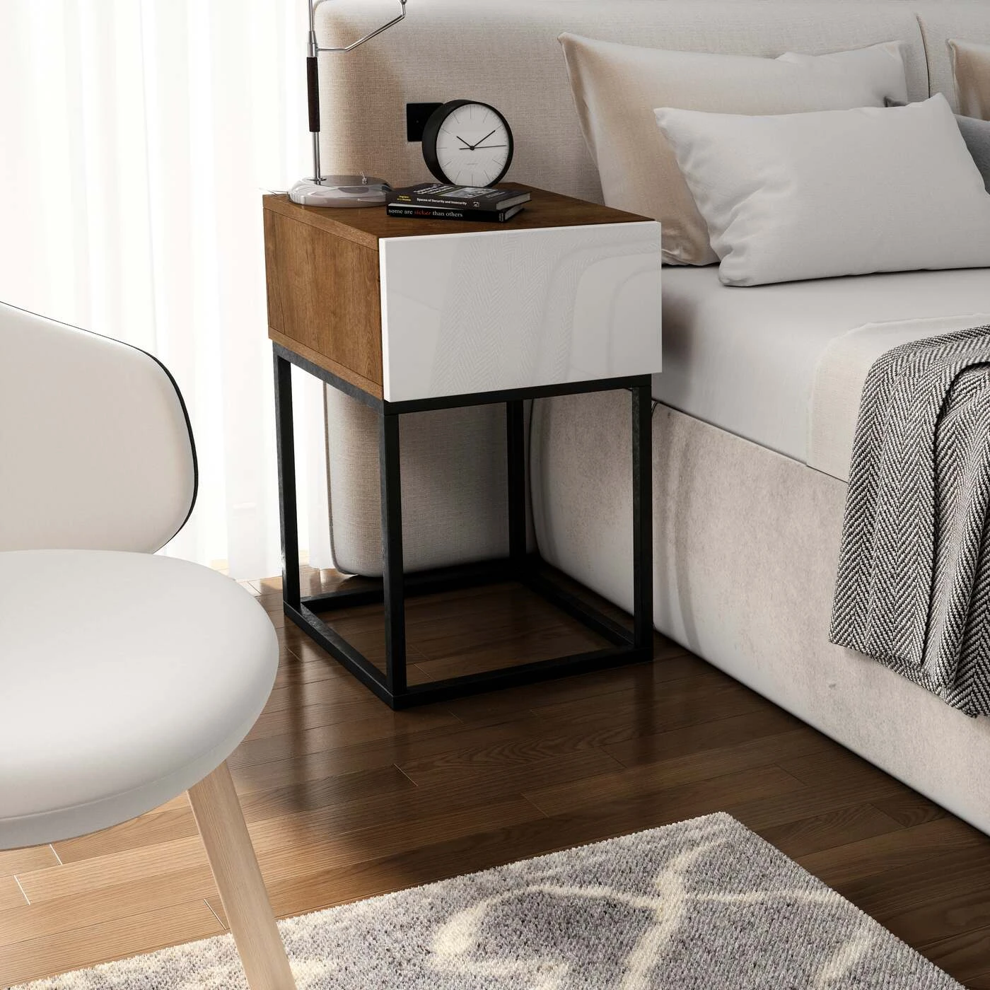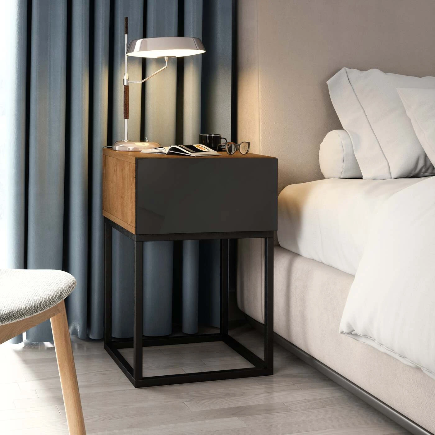 Turėkite būtiniausius daiktus po ranka su naktiniu staleliu iš EL4842 kolekcijos. Jei gera knyga priverčia miegoti iki vėlumos, galite tyliai įdėti ją į lengvai užsidarantį naktinio staliuko EL4842 stalčių nieko nepažadindami. Kavos staliukas EL4842 su kvadratiniu stalviršiu ir vienu stalčiumi yra puiki vieta žurnalams ar prie naktinės lempos. Jo minimalistinis dydis: 40 x 40 x 60 cm leidžia įkišti net į ankštus ir siaurus kampus. Baldo viršus pagamintas iš MDF ir padengtas laminatu. Dėl storų metalinių juodų kojų ir pagrindo naktinis staliukas EL4842 yra labai stabilus ir patvarus. Balduose naudojama plastikinė konfigūracija – amatinio ąžuolo derinys su balta arba juoda spalva.