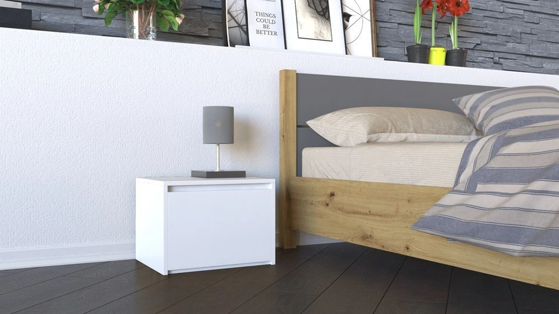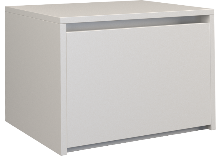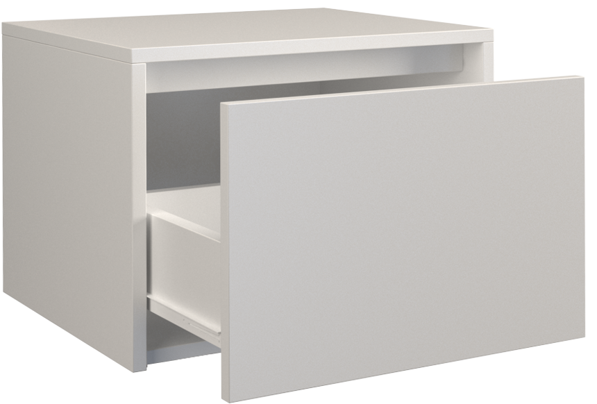 Vieno stalčiaus naktinė spintelė;Spintelė pagaminta iš 16 mm storio medžio drožlių plokštės (MDP);Spintelės kraštai dengti ABS danga, kuri pasižymi dideliu mechaniniu ir cheminiu atsparumu;Spintelės išmatavimai: plotis – 45 cm, gylis - 38 cm, aukštis – 34 cm;Ritininiai bėgeliai apsaugo stalčius nuo iškritimo;Spintelės spalva: balta;