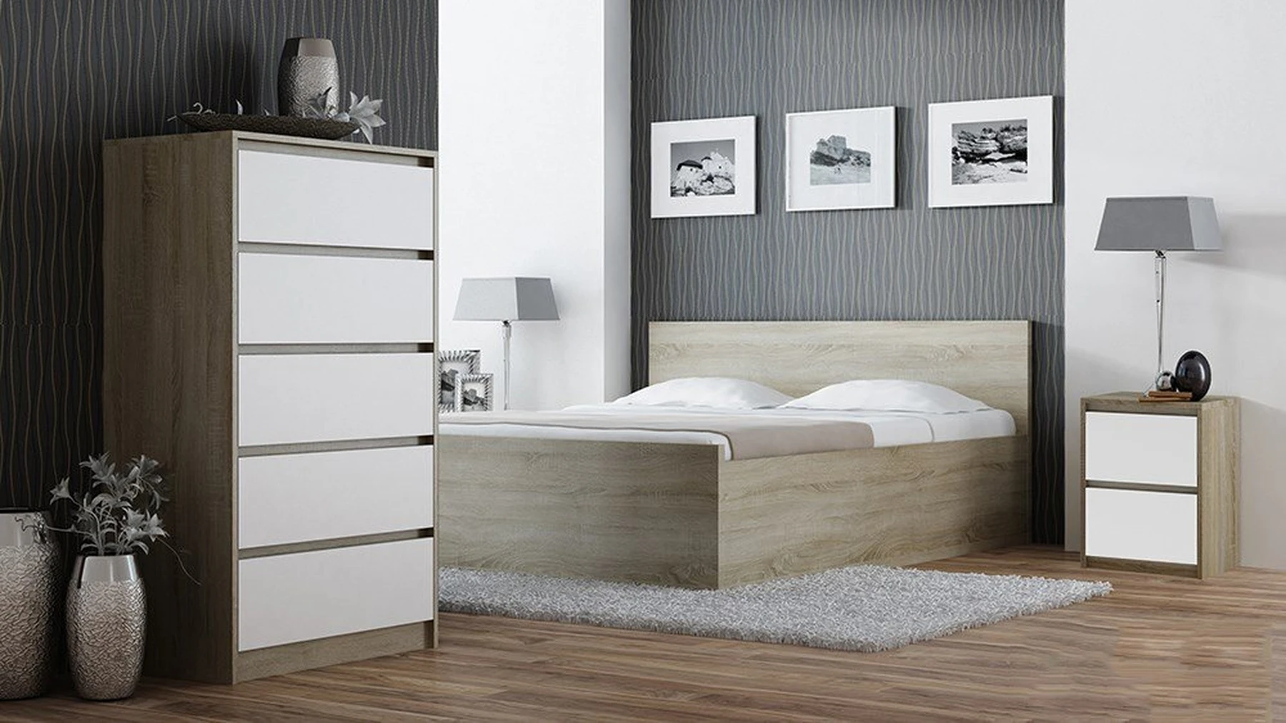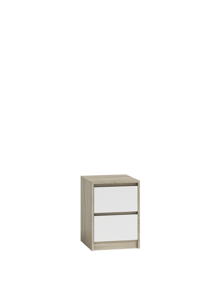 Dviejų stalčių naktinė spintelė;Spintelė pagaminta iš medžio drožlių plokštės (MDP);Spintelės kraštai dengti PVC danga, kuri pasižymi dideliu mechaniniu ir cheminiu atsparumu;Spintelės išmatavimai: plotis – 40 cm, gylis - 43 cm, aukštis – 55 cm;Ritininiai bėgeliai apsaugo stalčius nuo iškritimo;Spintelės spalva: balta/ąžuolo (sonoma);Prekė bus pristatyta nesurinkta.