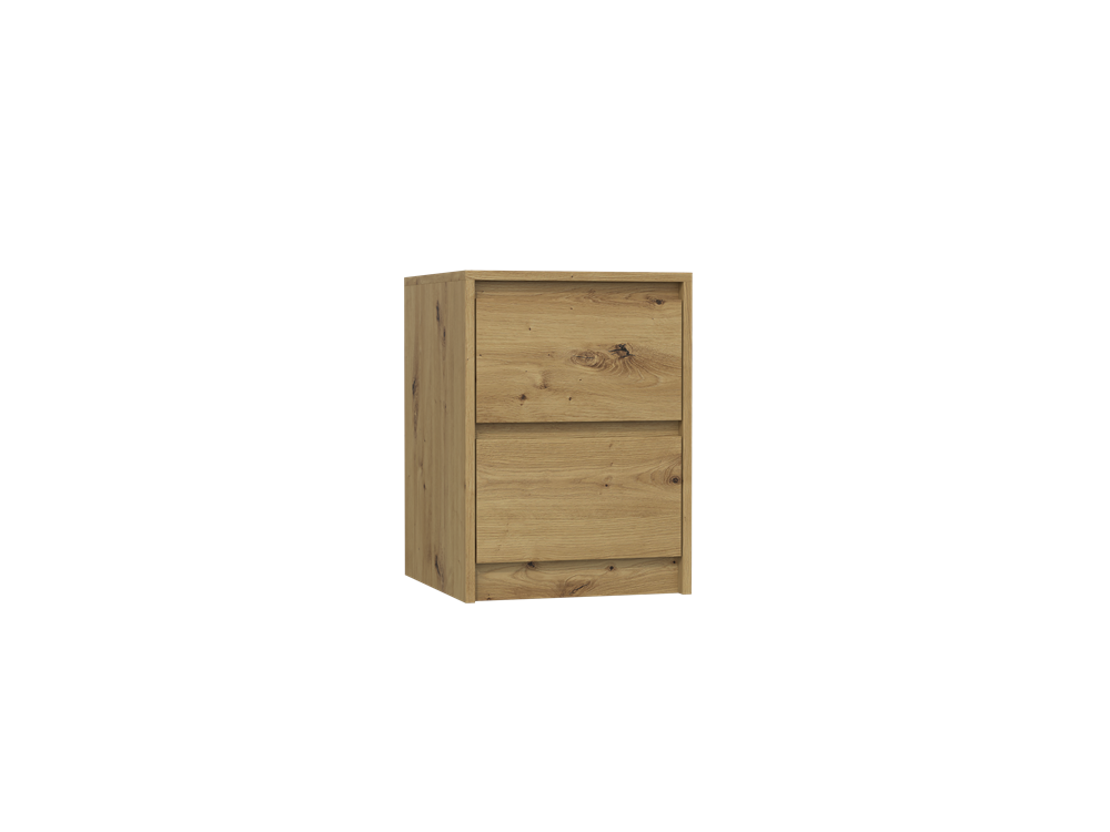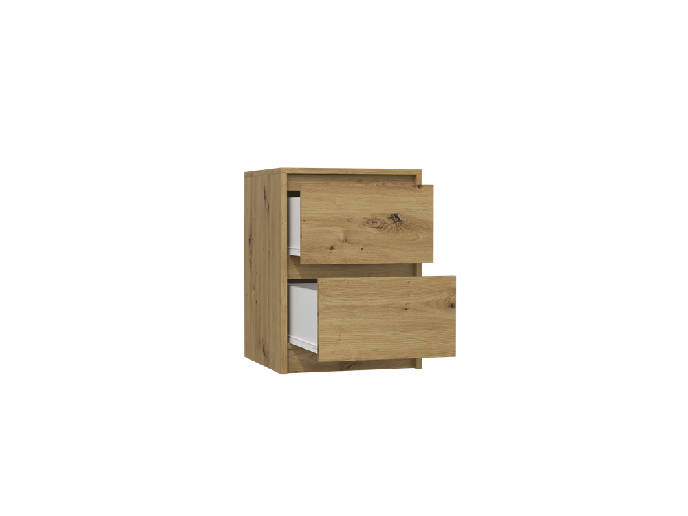 Dviejų stalčių naktinė spintelė;Spintelė pagaminta iš medžio drožlių plokštės (MDP);Spintelės kraštai dengti PVC danga, kuri pasižymi dideliu mechaniniu ir cheminiu atsparumu;Spintelės išmatavimai: plotis – 40 cm, gylis - 43 cm, aukštis – 55 cm;Ritininiai bėgeliai apsaugo stalčius nuo iškritimo;Spintelės spalva: ruda (artisan oak);