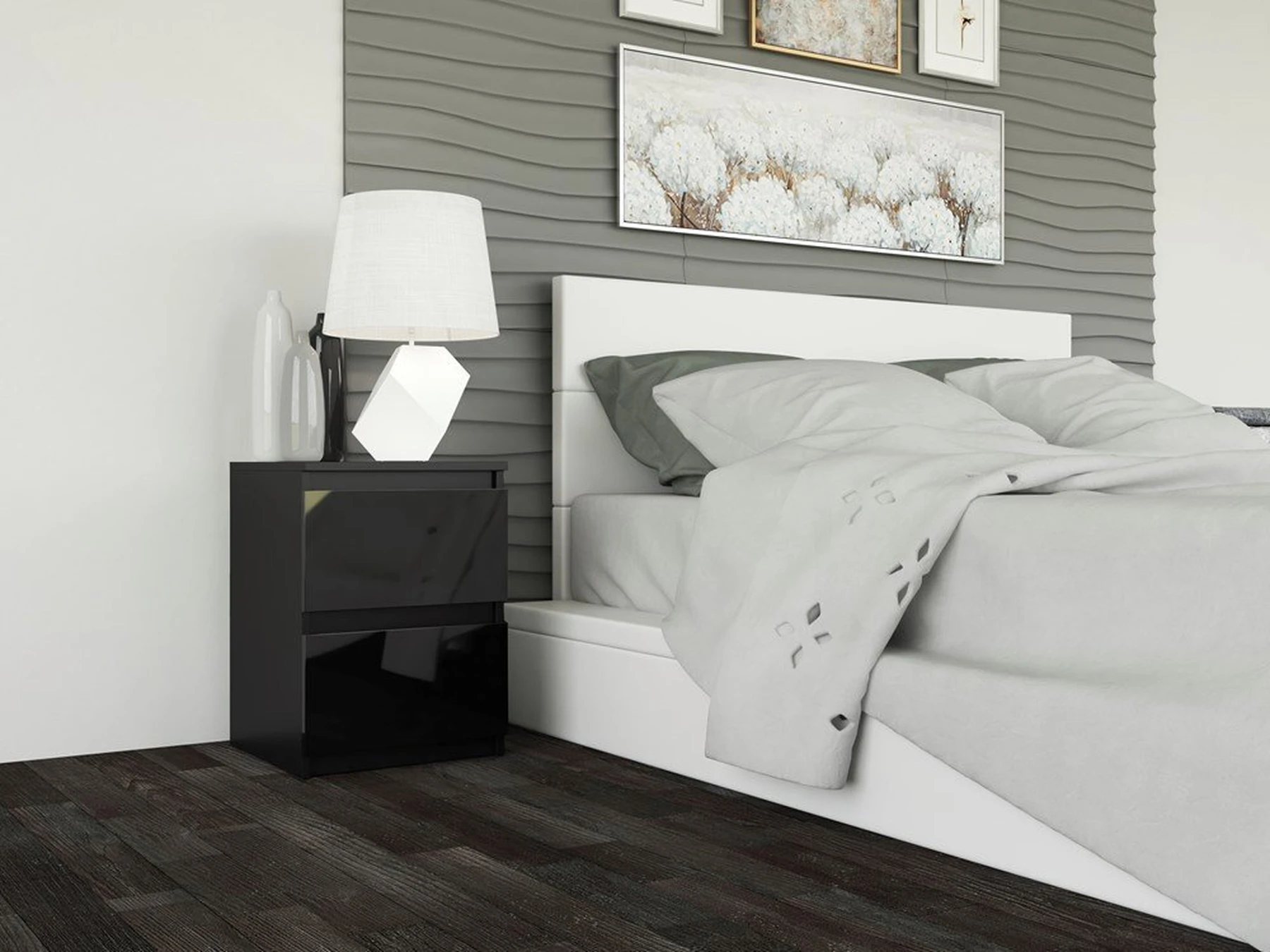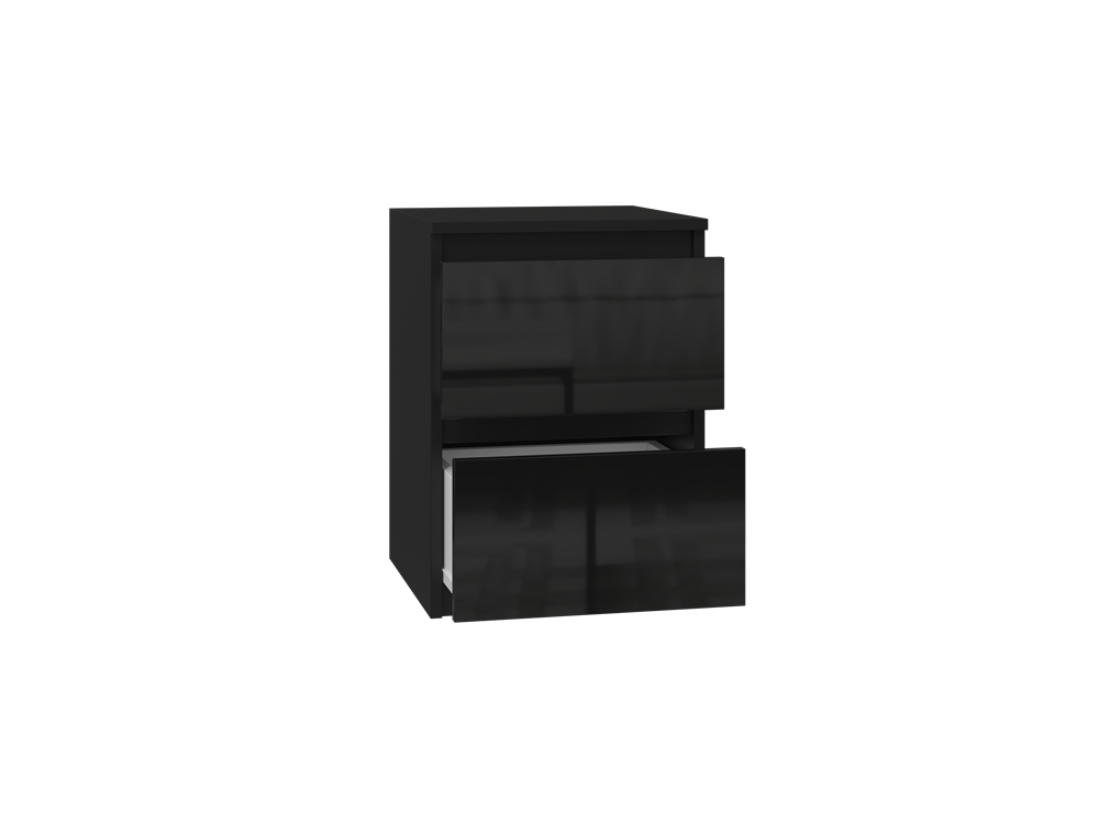 Dviejų stalčių naktinė spintelė;Spintelės išmatavimai: aukštis - 40 cm, plotis - 30 cm, gylis - 30 cm;Pagaminta iš laminuotos medžio drožlių plokštės (MDP);Spalva: blizgi juoda;Spintelės kraštų apdailos medžiaga: PVC;Stalčių bėgeliai ritininiai, metaliniai;