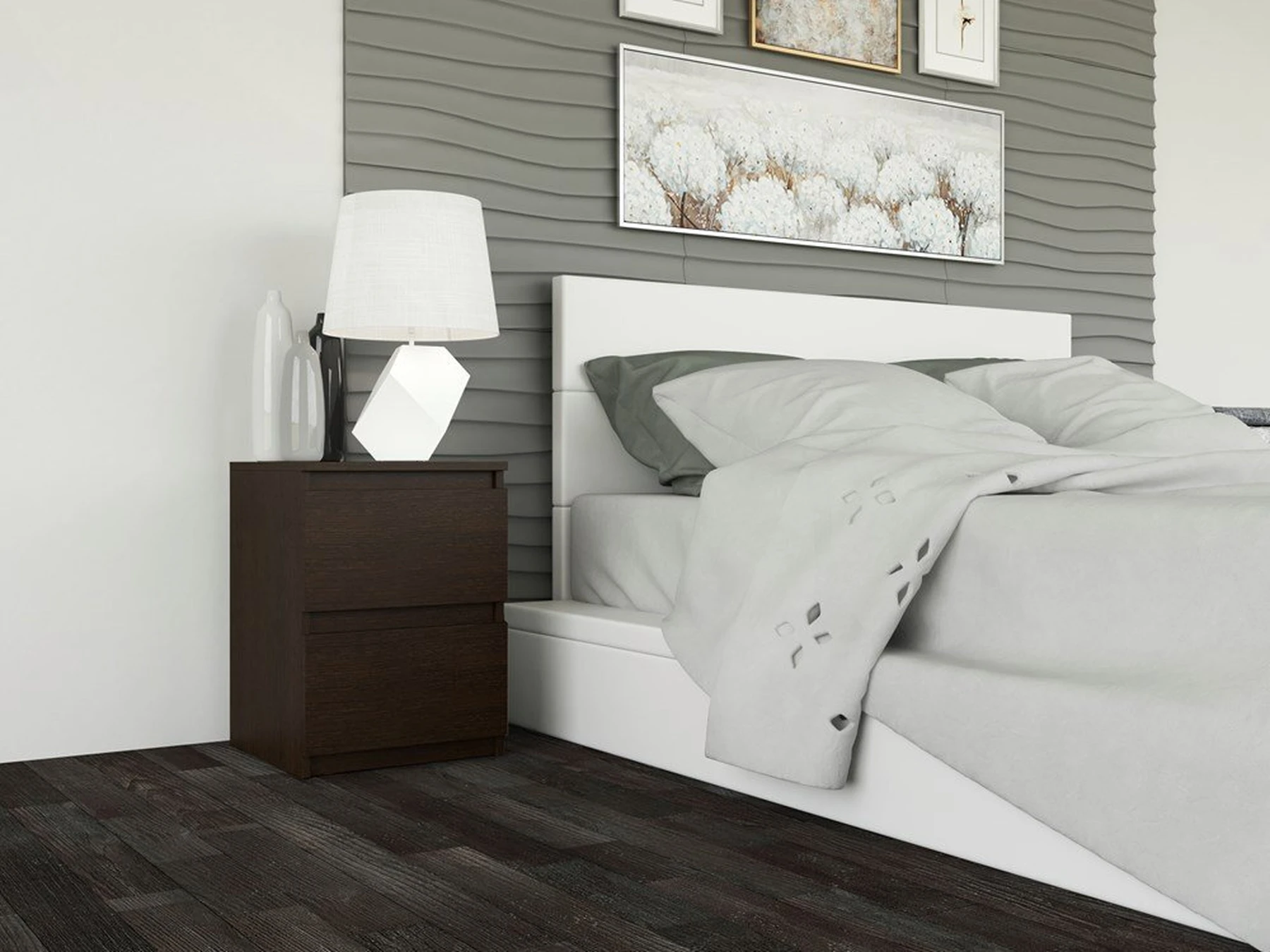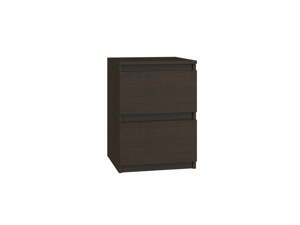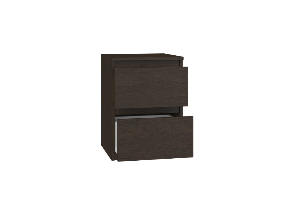 Dviejų stalčių naktinė spintelė;Spintelės išmatavimai: aukštis - 40 cm, plotis - 30 cm, gylis - 30 cm;Pagaminta iš laminuotos medžio drožlių plokštės (MDP);Spalva: tamsiai ruda (wenge);Spintelės kraštų apdailos medžiaga: PVC;Stalčių bėgeliai ritininiai, metaliniai;