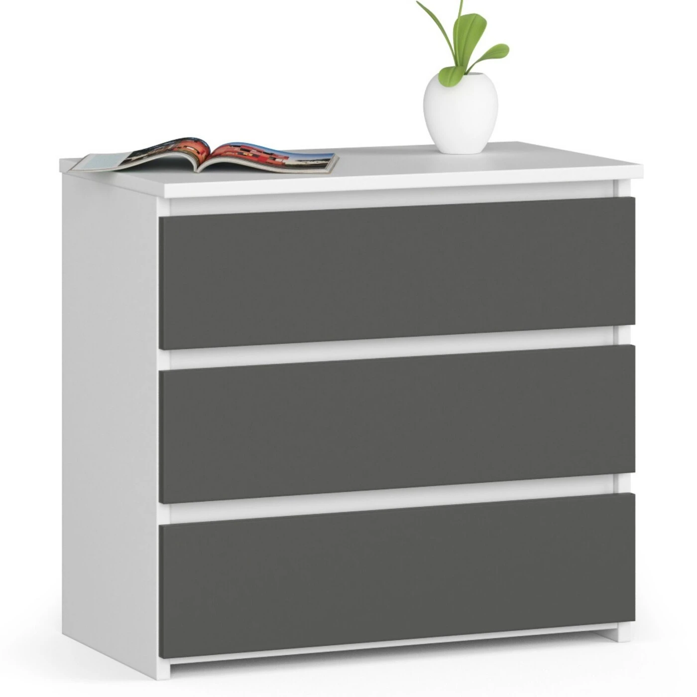 Aprašymas buvo automatiškai išverstas, gali pasitaikyti klaidų. Komoda, naktinis staliukas, CL3 modelis yra nesenstančio stiliaus baldas. Pilkas grafitas kartu su baltu – modernus derinys, kuris vis labiau populiarėja. Šis baldas gali puikiai papildyti madingiausias interjero tendencijas: minimalistinius, industrinius ir skandinaviškus derinius. Balto/pilko grafito naktinis staliukas atrodo stilingai ir moderniai. Be didelių estetinių vertybių, verta atkreipti dėmesį į jo funkcionalumą. Dėka didelių ir erdvių stalčių, patogu laikyti, o ant plataus stalviršio galima pasidėti, pavyzdžiui, naktinę lempą ir mėgstamą skaitymą. Komoda, naktinis staliukas puikiai tiks ne tik miegamajame, bet ir svetainėje bei jaunimo kambaryje. Tai universalus baldas, puikiai derinamas su kitais baldais. Nesenstančios spalvos, elegantiškas dizainas ir didelės praktinės vertės yra puikus derinys. Šis baldas skirtas visiems, kurie vertina aukštą komforto lygį kasdieniame gyvenime. - Komoda iš 16 mm aukštos kokybės laminuotos plokštės Kronospan, atspari trinčiai - Stalčių fasadai iš laminuotos plokštės - Stalčiai juda ant metalinių slankiojančių ritinėlių - Kraštai padengti ABS briauna, užtikrinančia aukštą apsaugą nuo pažeidimų - Savarankiškai surenkama komoda - Pridedama instrukcija – 24 mėnesių garantija