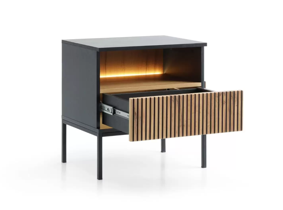 Modernaus dizaino baldas lengvai pritaikomas šiuolaikinio stiliaus interjere.Išmatavimai: plotis: 54 cm; aukštis: 56 cm; gylis: 39 cm.Medžiaga: MDP/MDF plokštė, plienas. Korpusas padengtas ABS briauna. Pritaikyta robotui siurbliui. Push to open atidarymo mechanizmas. Tylaus uždarymo sistema. LED apšvietimas.