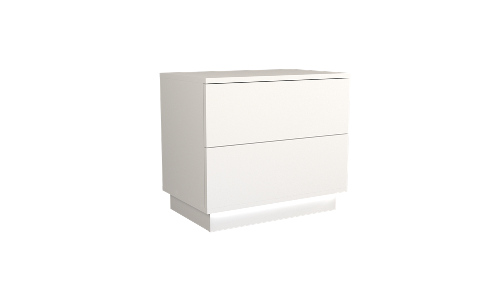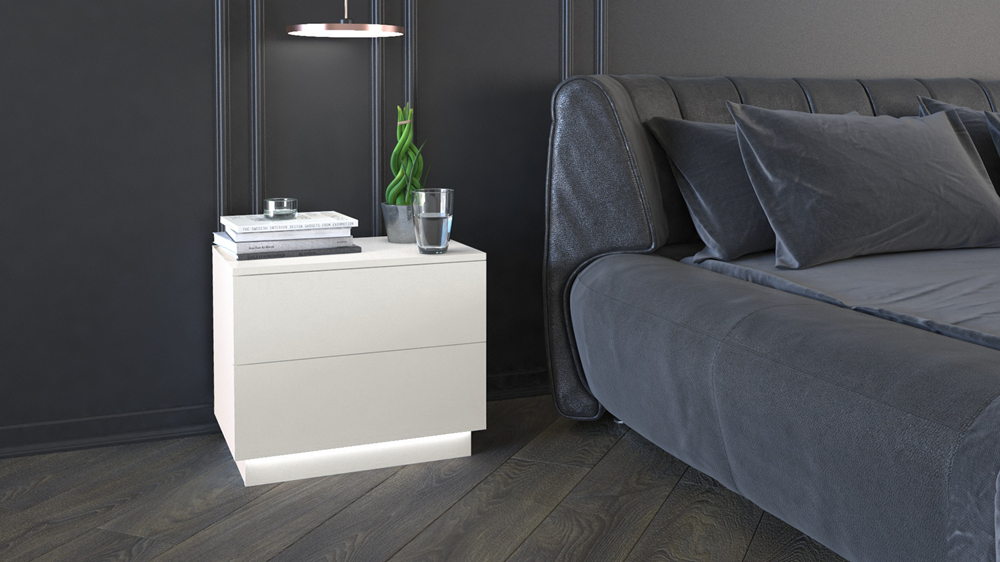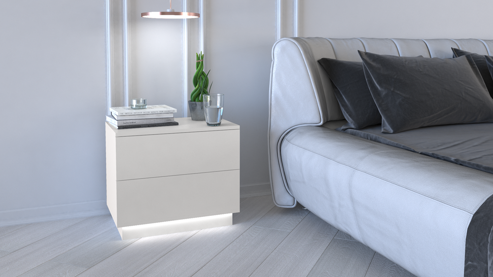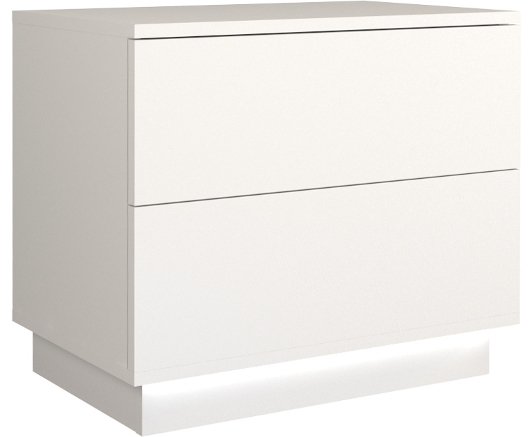 Dviejų stalčių naktinė spintelė;Spintelė pagaminta iš 16 mm storio medžio drožlių plokštės (MDP);Spintelės kraštai dengti PVC danga, kuri pasižymi dideliu mechaniniu ir cheminiu atsparumu;Spintelės išmatavimai: plotis – 55 cm, gylis - 35 cm, aukštis – 47 cm;Ritininiai bėgeliai apsaugo stalčius nuo iškritimo;Integruotas LED apšvietimas spintelės apatinėje dalyje;Spintelės spalva: balta;
