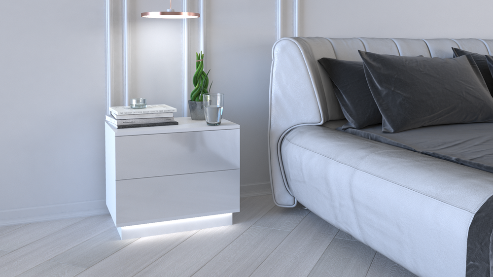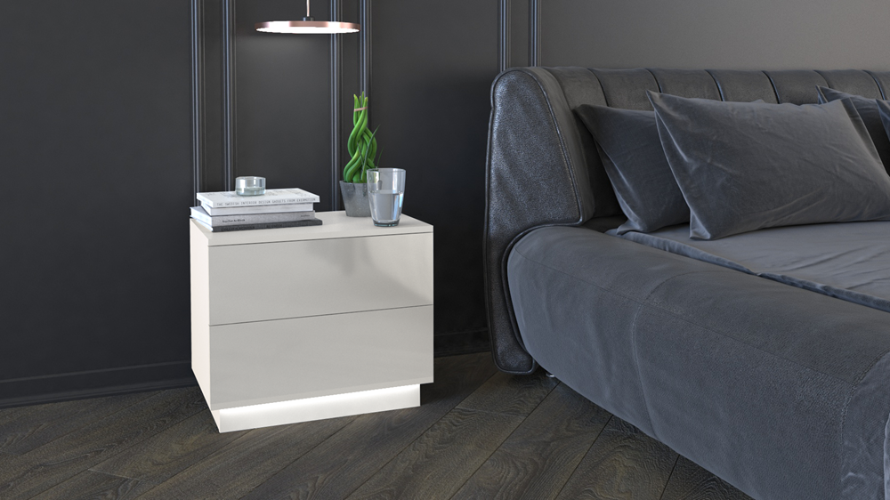 Dviejų stalčių naktinė spintelė;Spintelė pagaminta iš 16 mm storio medžio drožlių plokštės (MDP);Spintelės kraštai dengti PVC danga, kuri pasižymi dideliu mechaniniu ir cheminiu atsparumu;Spintelės išmatavimai: plotis – 55 cm, gylis - 35 cm, aukštis – 47 cm;Ritininiai bėgeliai apsaugo stalčius nuo iškritimo;Integruotas LED apšvietimas spintelės apatinėje dalyje;Spintelės spalva: blizgi balta;