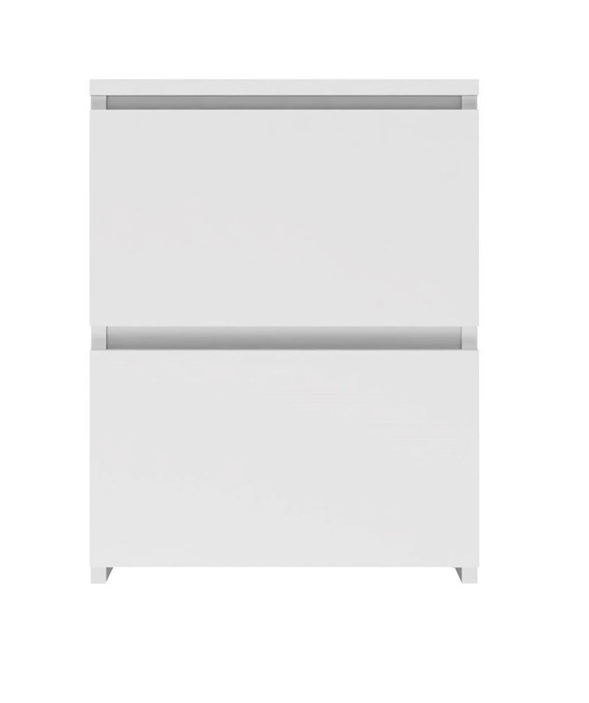 Moderni naktinė spintelė;Spintelė pagaminta iš laminuotos medžio drožlių plokštės;2 stalčiai;Išmatavimai: plotis - 40 cm, aukštis - 52 cm, gylis - 40 cm;Spalva: balta;