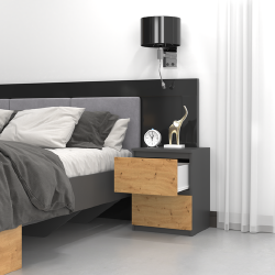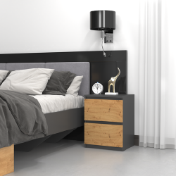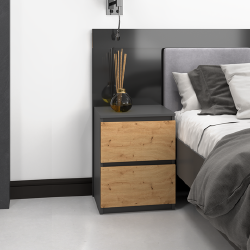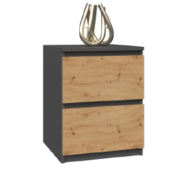 Moderni naktinė spintelė;Spintelė pagaminta iš laminuotos medžio drožlių plokštės;2 stalčiai;Išmatavimai: plotis - 40 cm, aukštis - 52 cm, gylis - 40 cm;Spalva: juoda/natūrali;