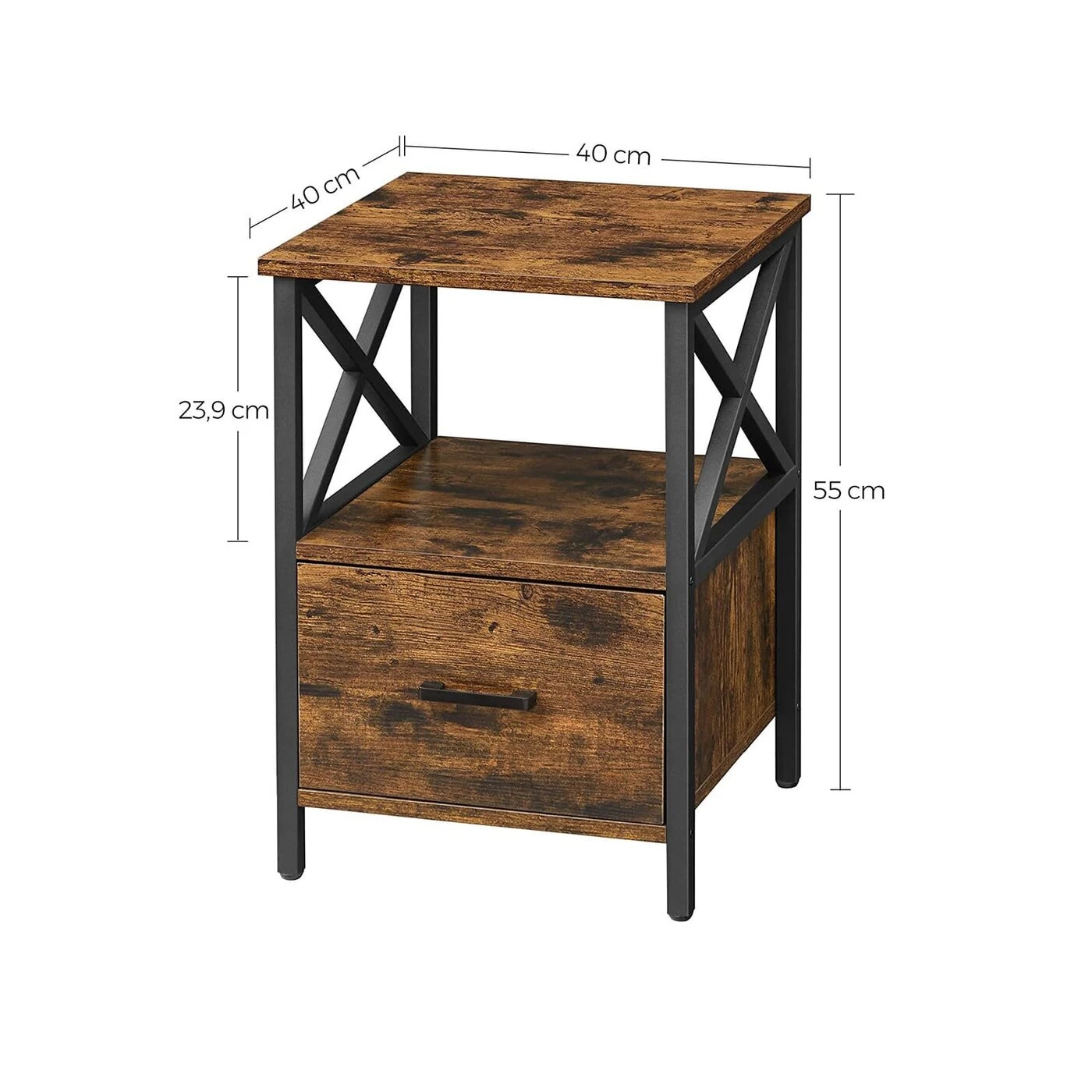 Aprašymas buvo automatiškai išverstas, gali pasitaikyti klaidų.Išsami informacija apie gaminį: - Spalva: vintažinė ruda-juoda - Medžiaga: medžio drožlių plokštės, plienas - Dydis: 40 x 40 x 55 cm (P x P x A) - Svoris: 11,7 kg - Maksimali bendra statinė apkrova: 30 kgPristatymo komplektas: - 1 x naktinis staliukas - 1 x priedų paketas - 1 x vadovas (DE, FR, EN, ES, IT) VASAGLE Pastabos: - Saugumo sumetimais vaikams draudžiama lipti ant gaminio ar žaisti su juo .