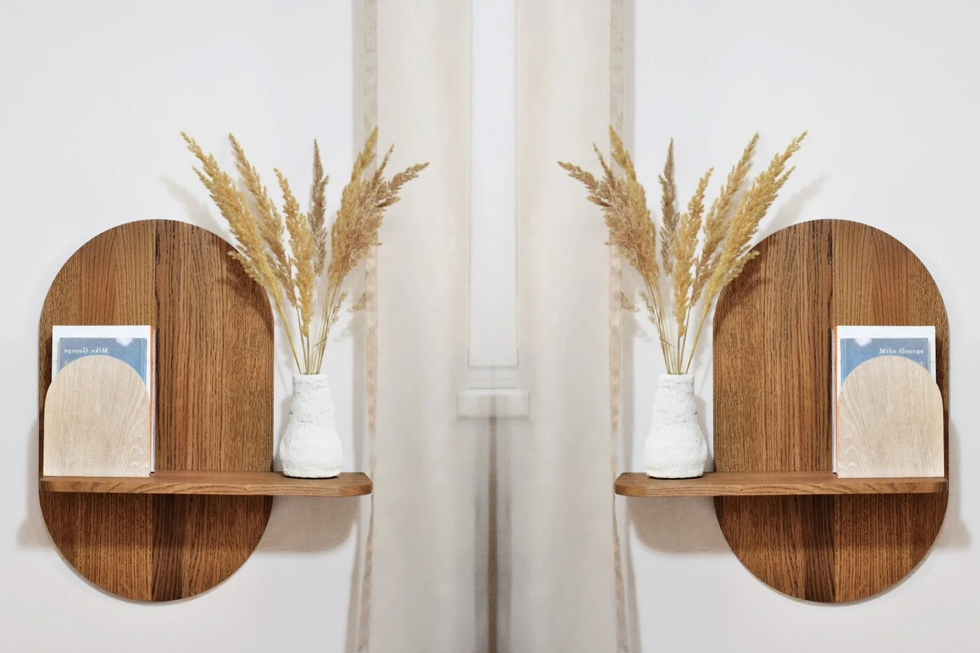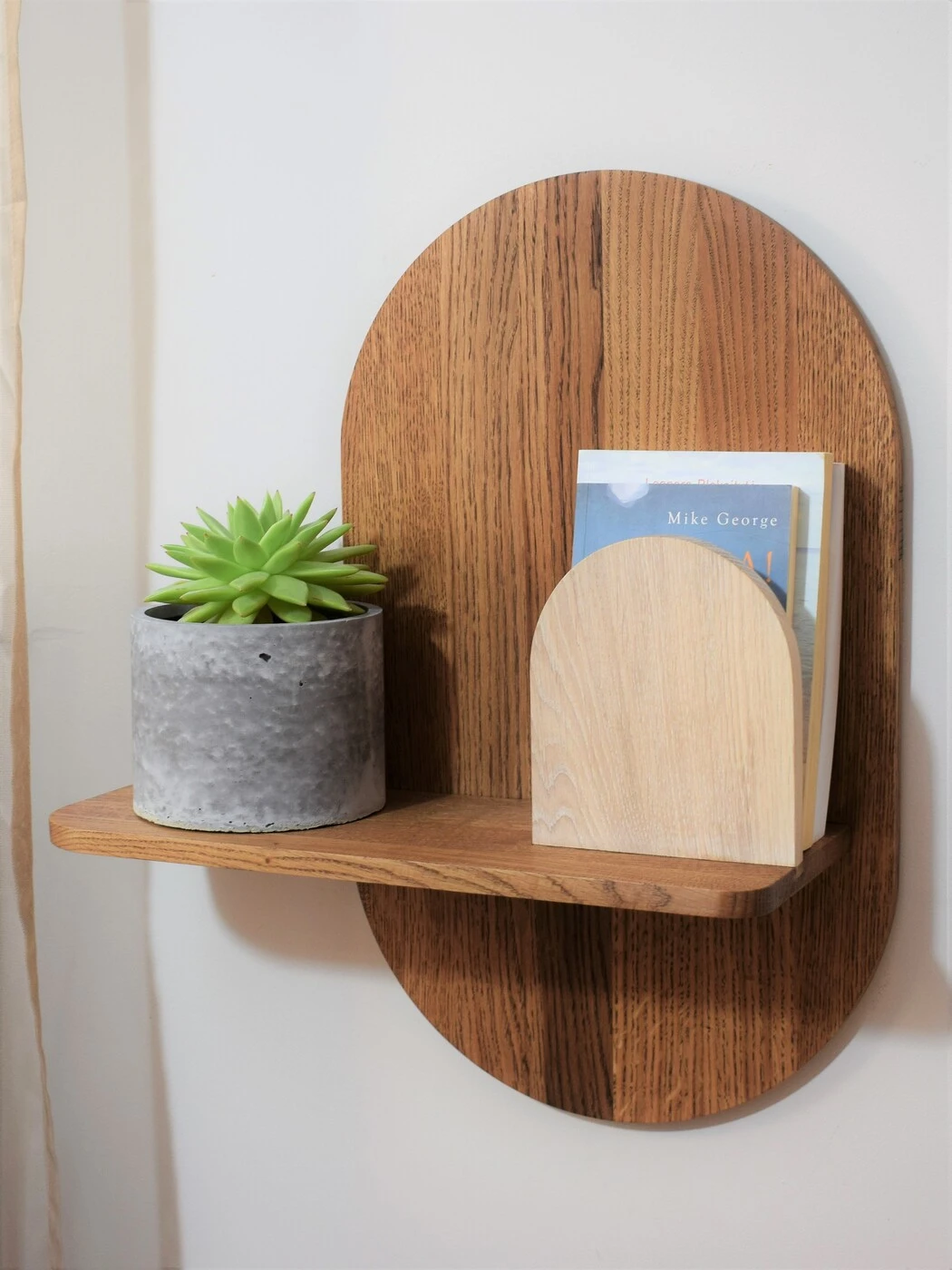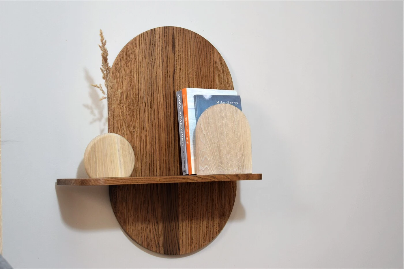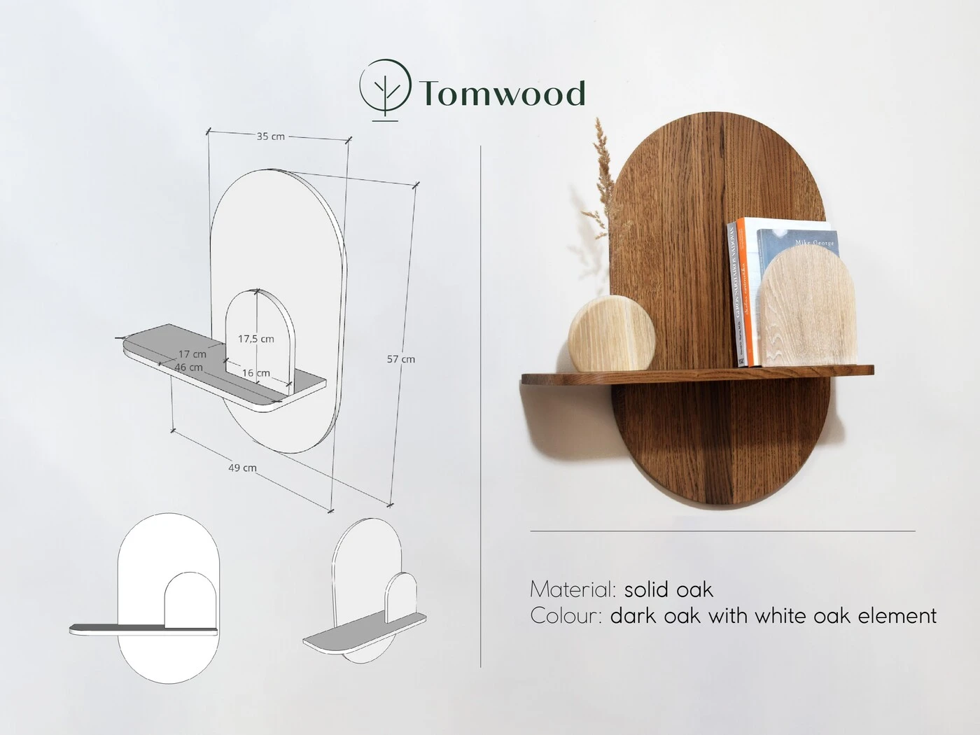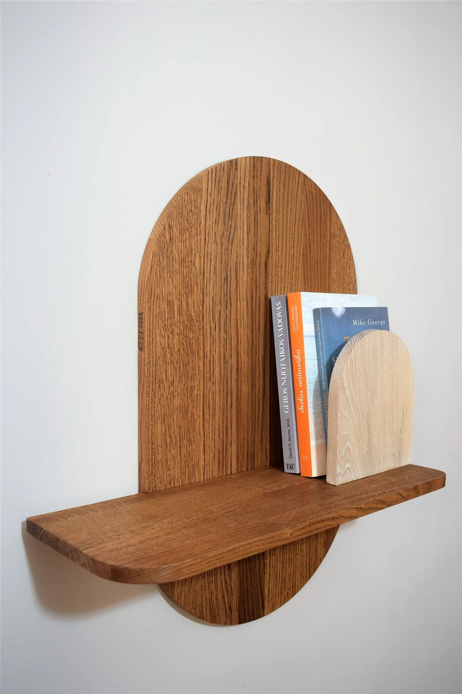 Minimalistinio dizaino, arkos formos plaukiojantis medinis naktinis staliukas pagamintas iš ąžuolo medienos ir padengtas rudu medienos aliejumi. Šis modernus naktinis staliukas tvirtinamas prie sienos ir gali būti naudojamas kaip sieninė lentyna svetainėje, prieškambaryje ar kitoje jūsų pasirinktoje patalpoje. Naktinis staliukas turi paslėptą erdvę su maža balta arka, už kurios galite laikyti daiktus, pavyzdžiui, knygas, telefoną, raktus, piniginę, laikrodį ar tiesiog vandenį rytui. Funkcionalus, neapkraunantis namų interjero naktinis staliukas ar lentyna, kuri papuoš Jūsų sieną, o natūralus medis įneš į namus šilumos ir lengvumo pojūtį.